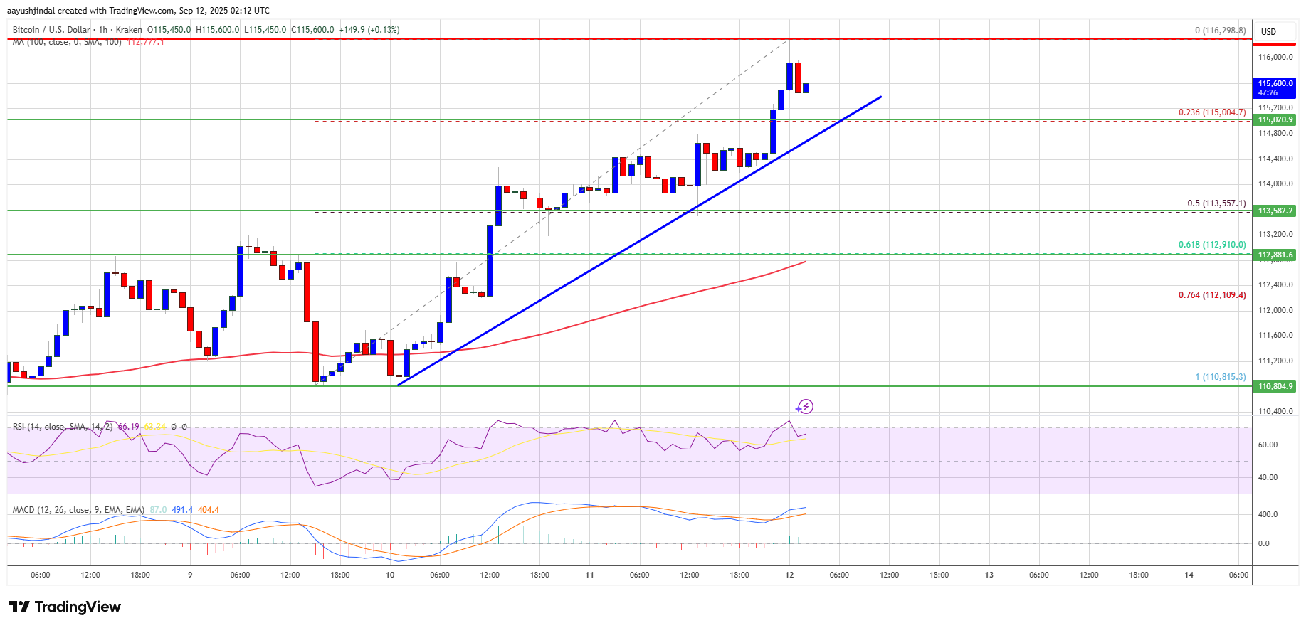 The bulls were able to push the price above $114,000 and $115,000. The price traded as high as $116,298 and recently started a consolidation phase. There was a minor decline below $115,800, but the price is still above the 23.6% Fib retracement level of the recent move from the $110,815 swing low to the $116,298 high.