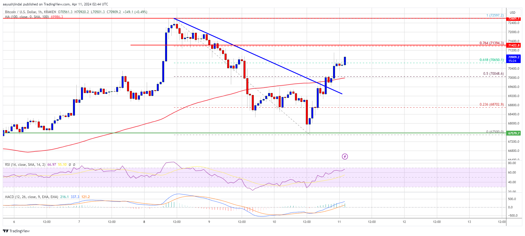 A low was formed at $67,500 and the price started a fresh increase. There was a move above the $69,200 and $69,500 resistance levels. The price cleared the 50% Fib retracement level of the downward move from the $72,597 swing high to the $67,500 low.