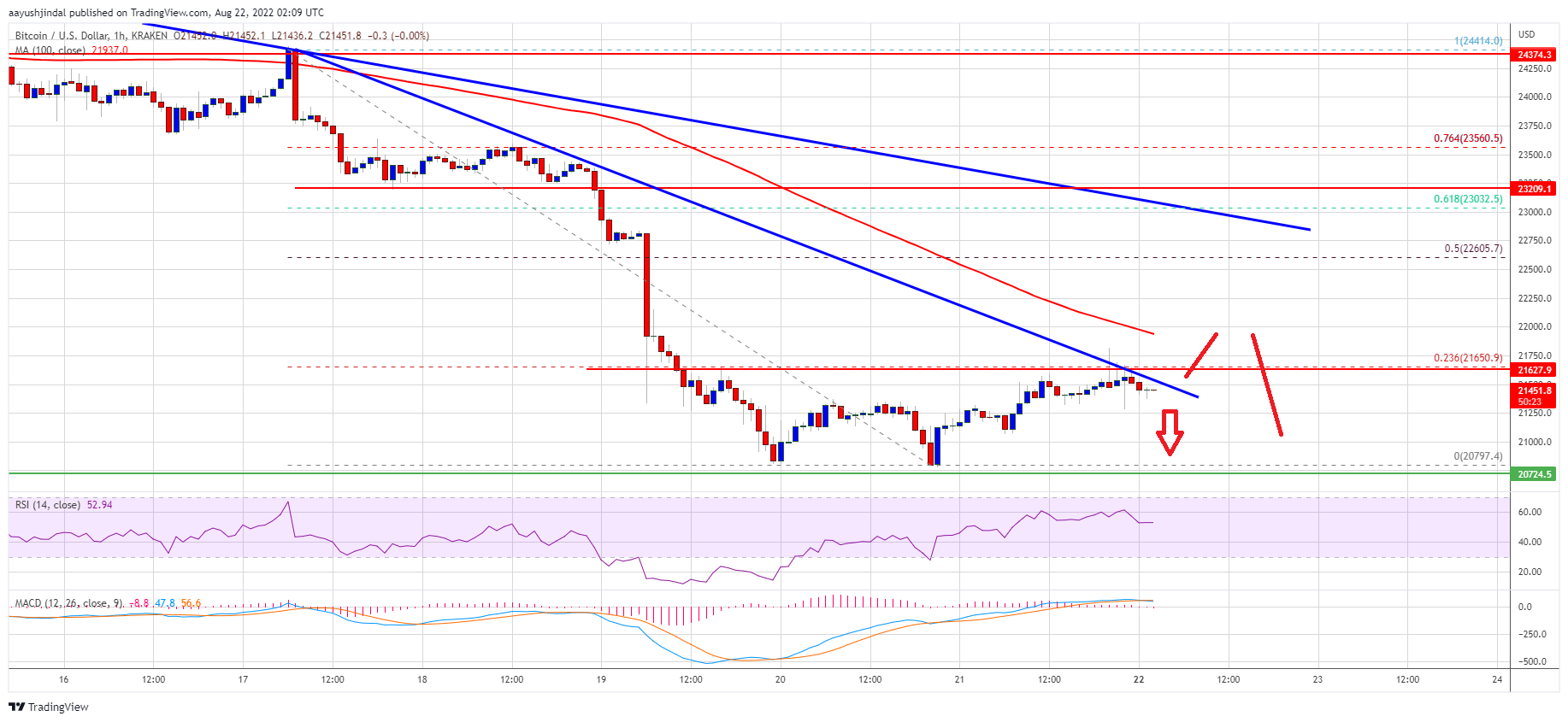 Recently, there was a push above the $21,250 level. However, bitcoin price struggled near the 23.6% Fib retracement level of the recent decline from the $24,414 swing high to $20,797 low.