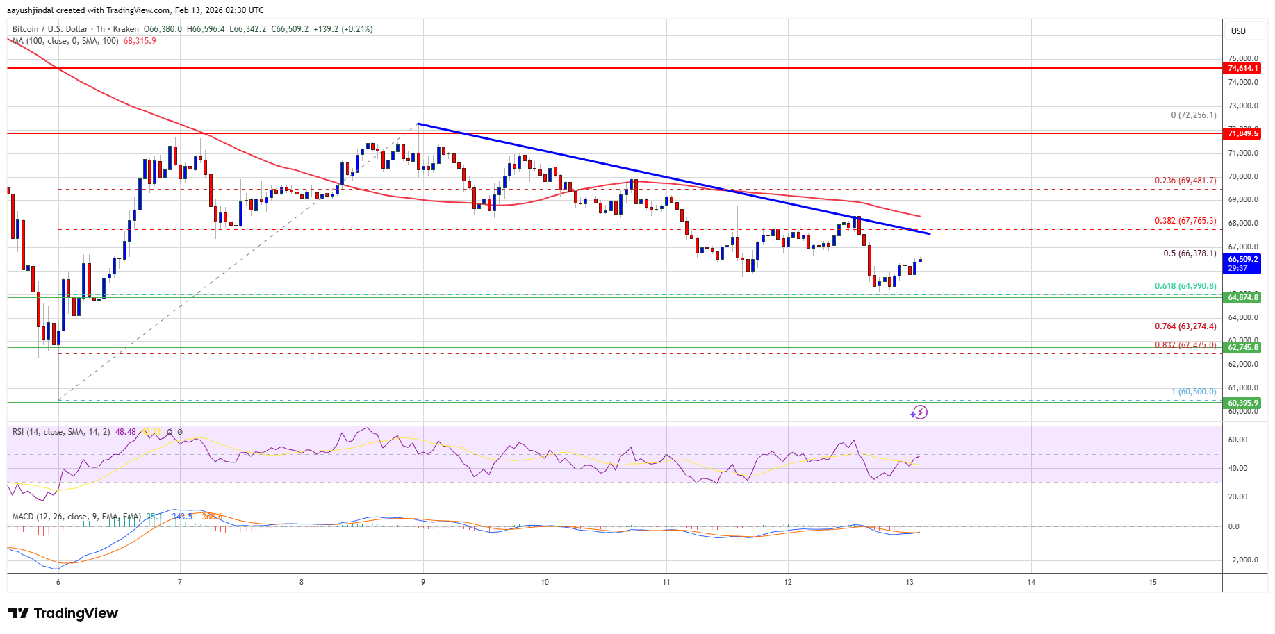 Bitcoin is now trading below $67,000 and the 100 hourly simple moving average. If the price remains stable above $65,000, it could attempt a fresh increase. Immediate resistance is near the $67,500 level and the trend line.