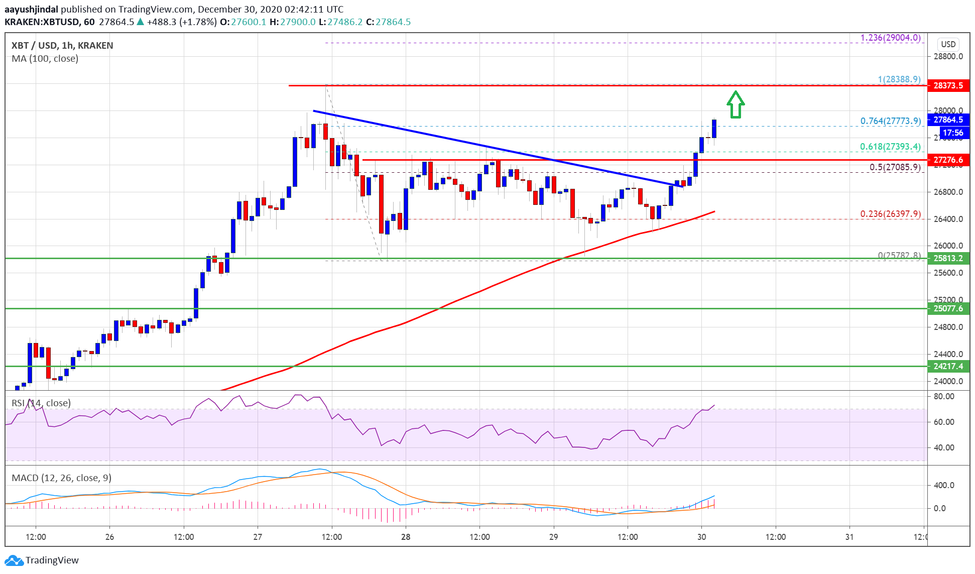 - The pair is likely to continue higher above $28,000 in the coming sessions.