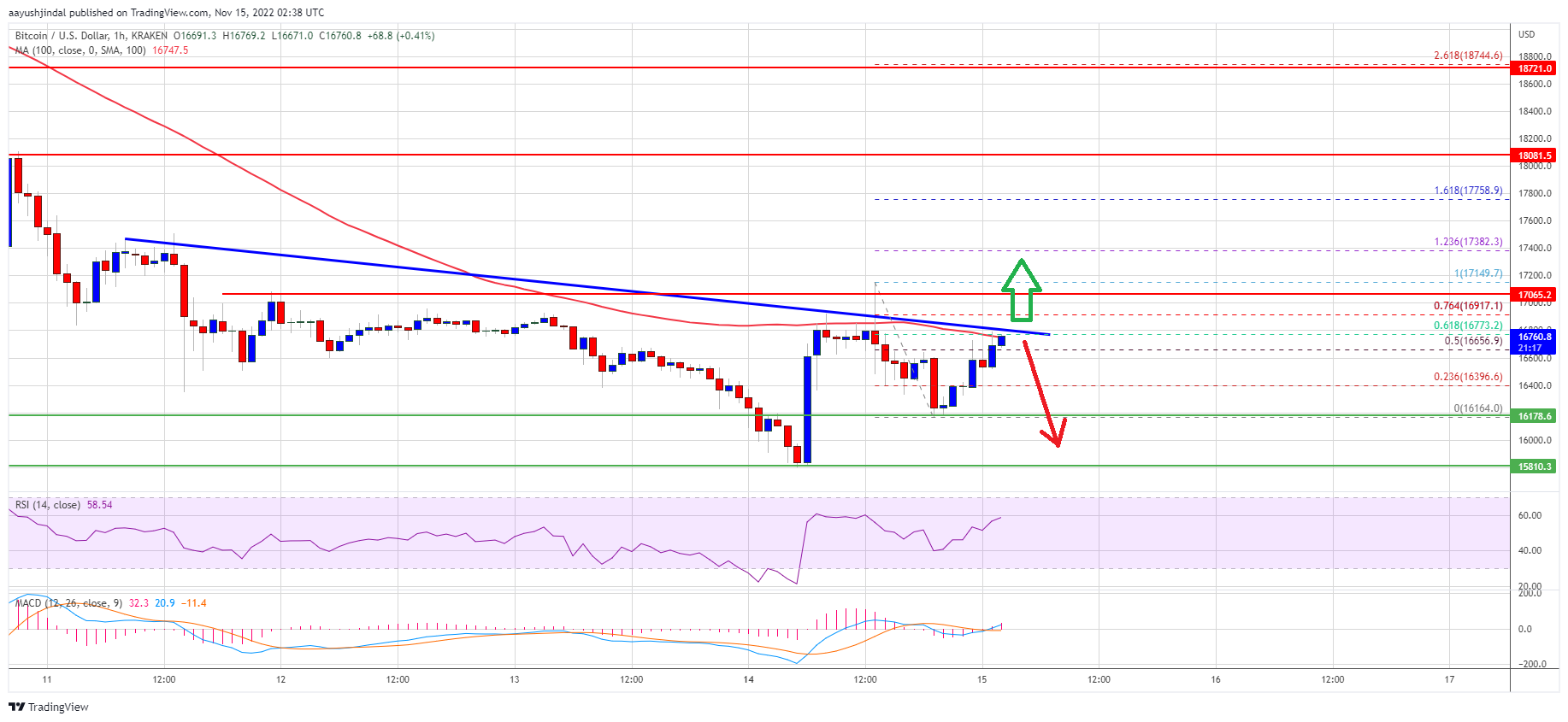However, the bulls were active above the $16,000 support zone. A low was formed near $16,164 and the price started a slow increase. There was a move above the $16,400 and $16,500 levels. The price cleared the 50% Fib retracement level of the recent decline from the $17,149 swing high to $16,154 low.