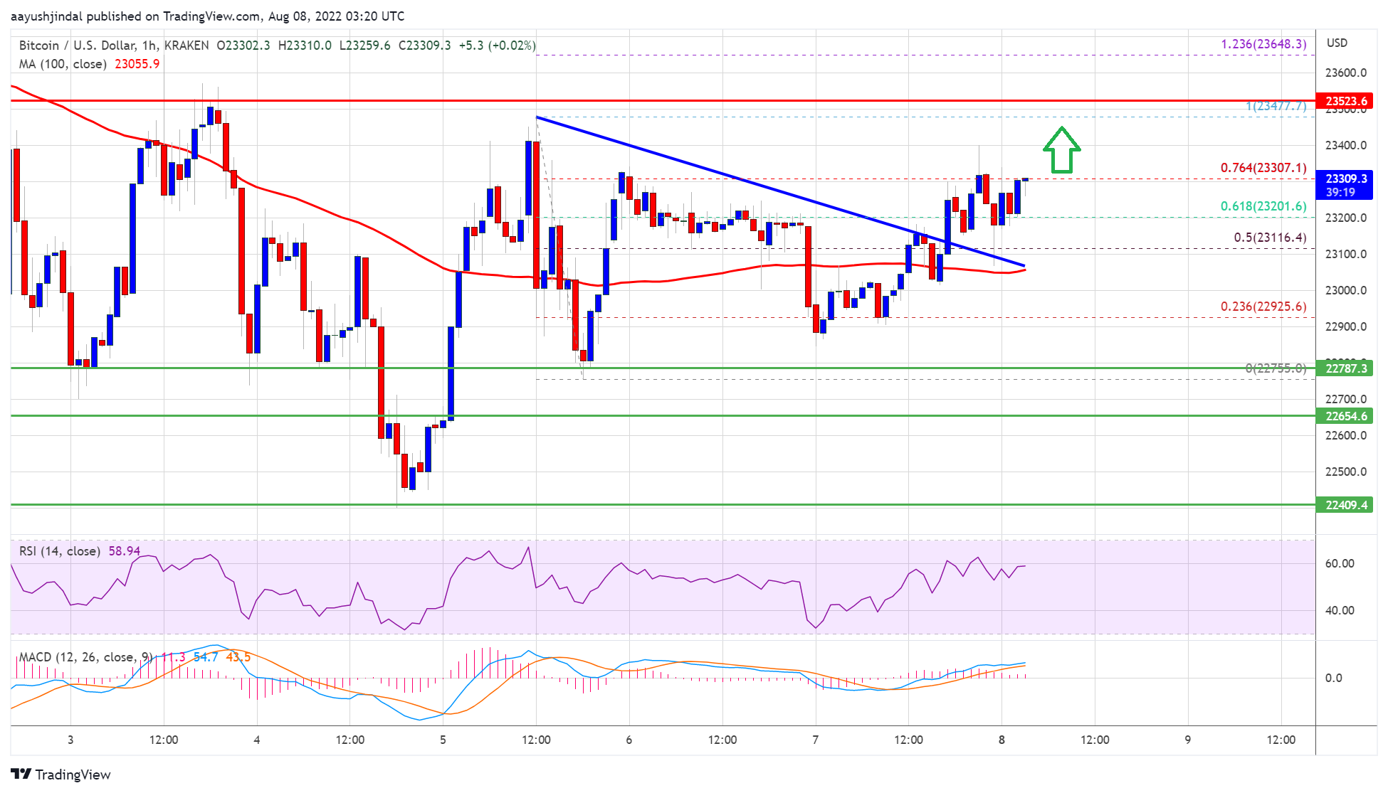 - The price is now trading above the $23,000 level and the 100 hourly simple moving average.
