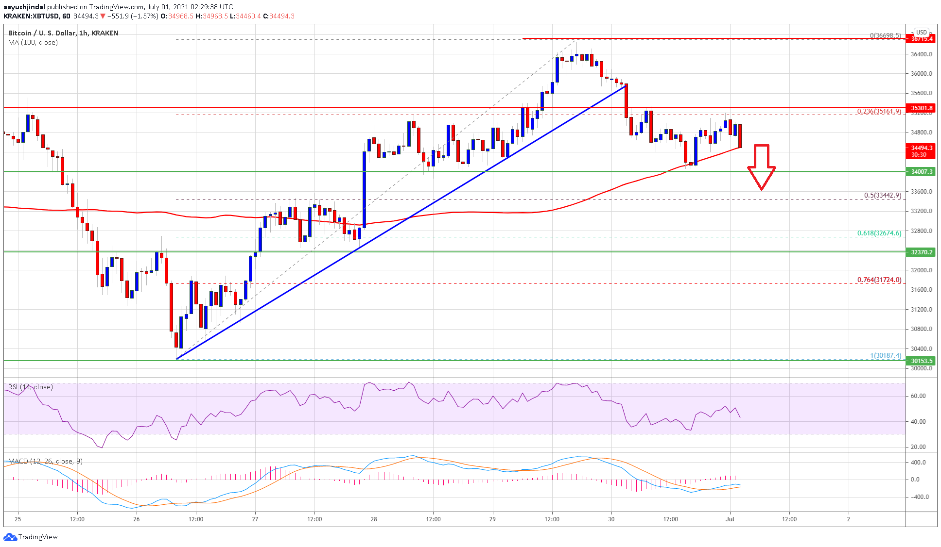 There was also a break below a key bullish trend line with support near $35,750 on the hourly chart of the BTC/USD pair. Bitcoin price is now trading near $34,500 and the 100 hourly simple moving average.