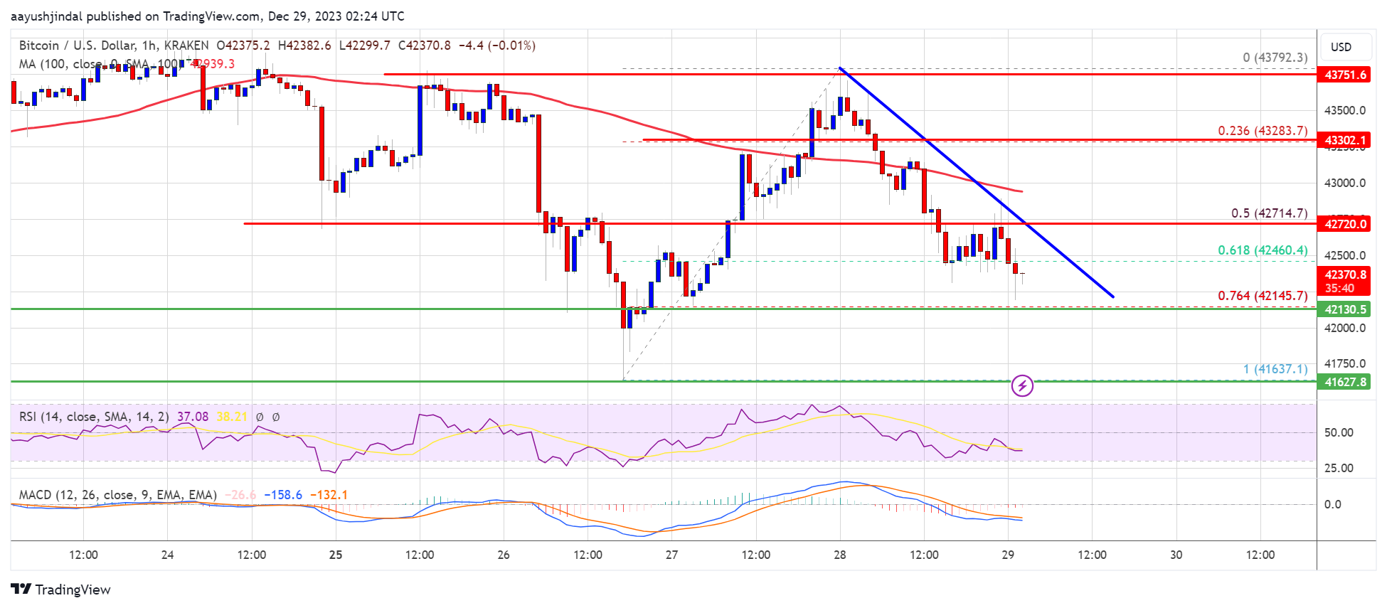 Bitcoin is now trading below $43,000 and the 100 hourly Simple moving average. It is also consolidating below the 61.8% Fib retracement level of the upward move from the $41,637 swing low to the $43,792 low.