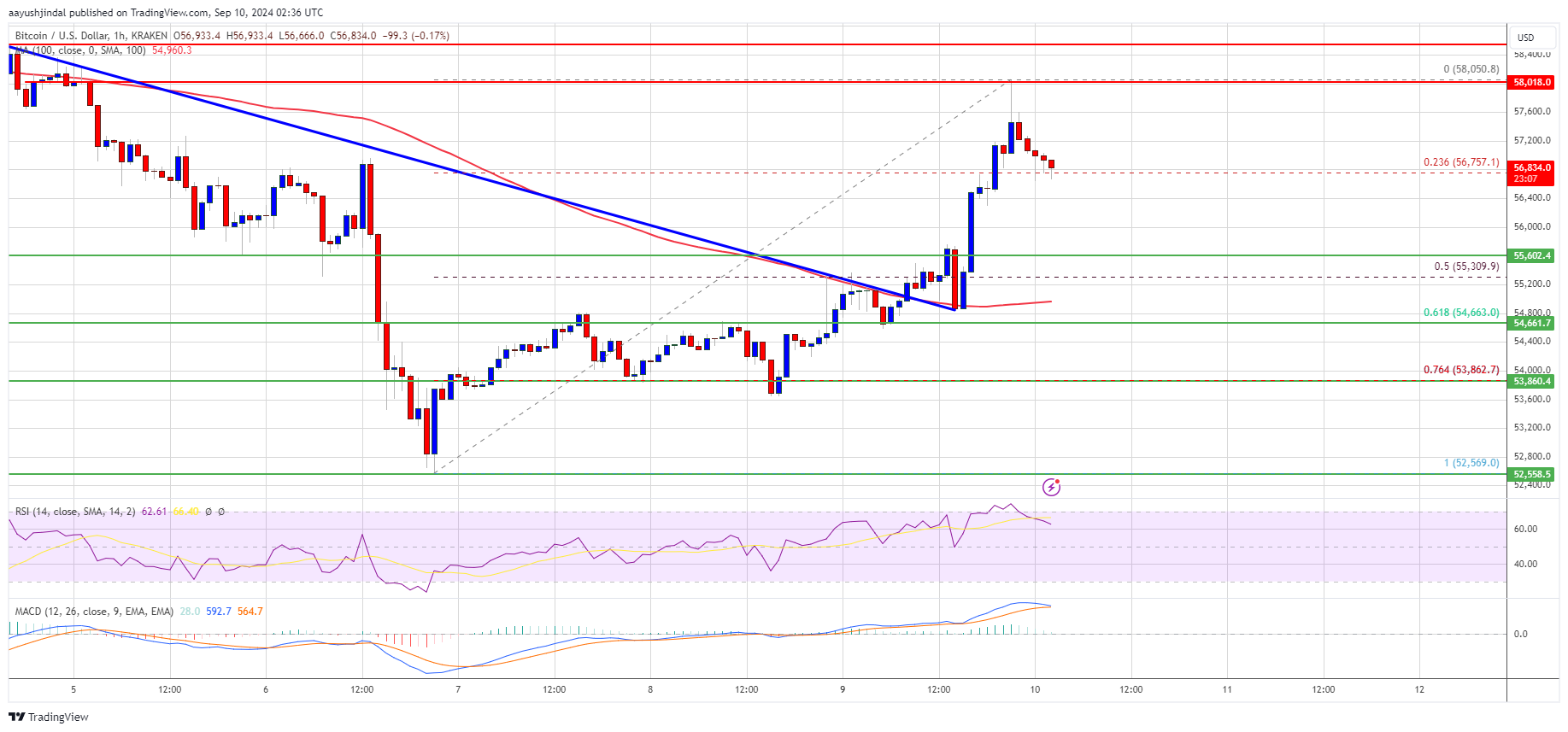 The pair even spiked above the $58,000 resistance zone. A high was formed at $58,050 and the price is now consolidating gains. There was a minor decline below the $57,500 level. The price dipped below the 23.6% Fib retracement level of the upward move from the $52,569 swing low to the $58,050 high.