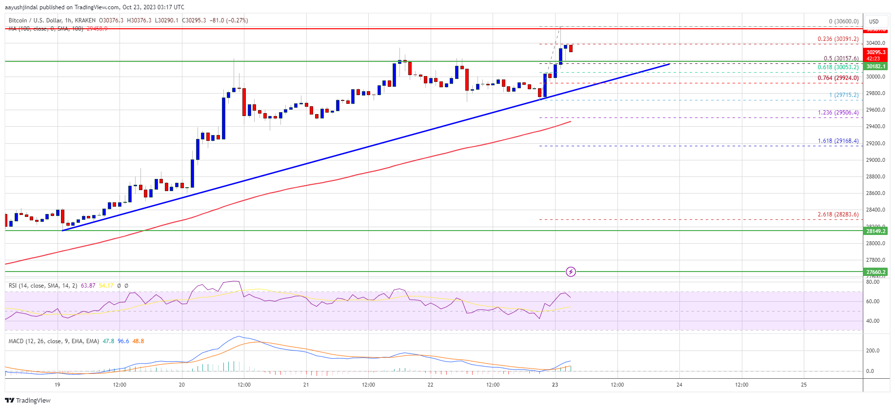 The bulls gained strength and managed to push the price above the main $30,000 resistance zone. A new multi-week high is formed near $30,600 and the price is now consolidating gains. There was a minor decline below the 23.6% Fib retracement level of the upward move from the $29,715 swing low to the $30,600 high.