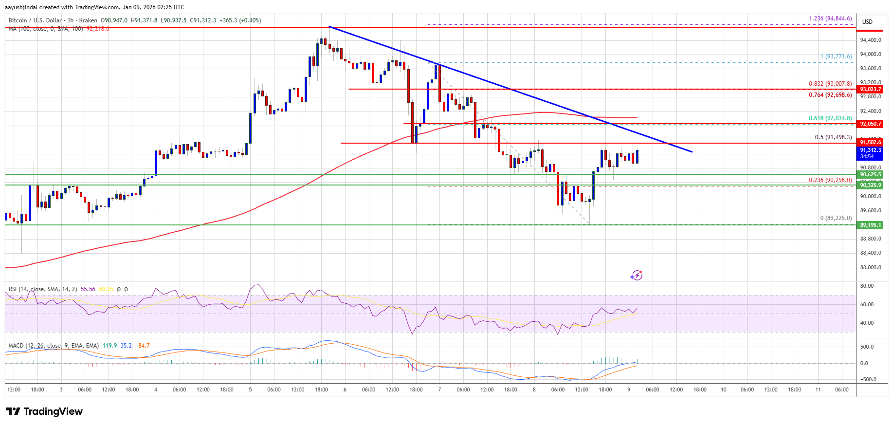 The price even dipped below $91,200 and tested $90,000. A low was formed at $89,225 and the price is now attempting a fresh increase. There was a move above $90,500. The price climbed higher to test the 50% Fib retracement level of the recent decline from the $93,770 swing high to the $89,225 low.