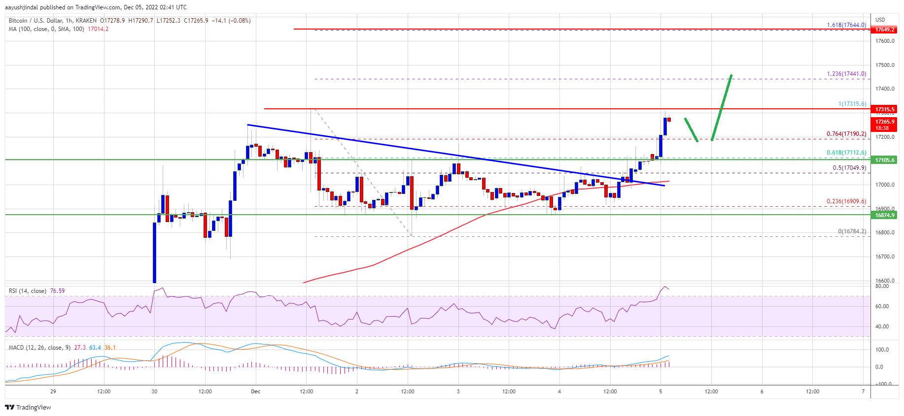• Bitcoin started a fresh increase above $17,000 and $17,200 resistance levels.