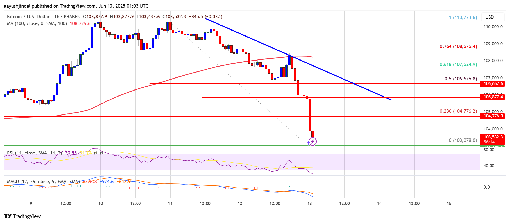 The price even dipped below the $104,200 support level. Finally, it tested the $103,000 zone. A low was formed at $103,078 and the price is now consolidating losses below the 23.6% Fib level of the recent decline from the $110,273 swing high to the $103,078 low.