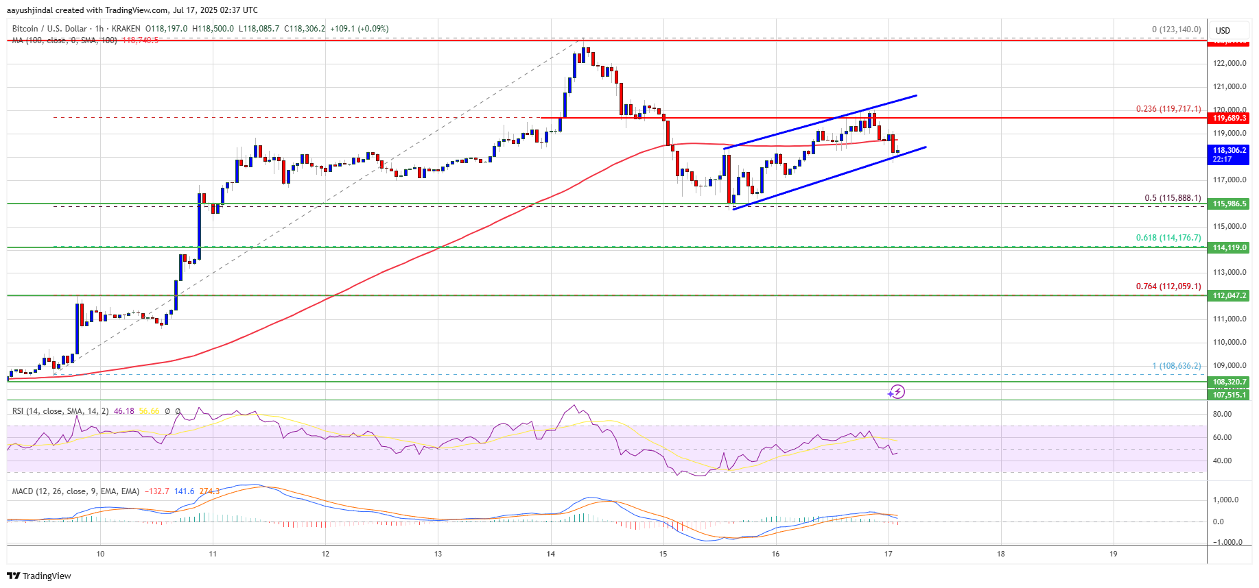 - There is a rising channel forming with support at $118,200 on the hourly chart of the BTC/USD pair (data feed from Kraken).