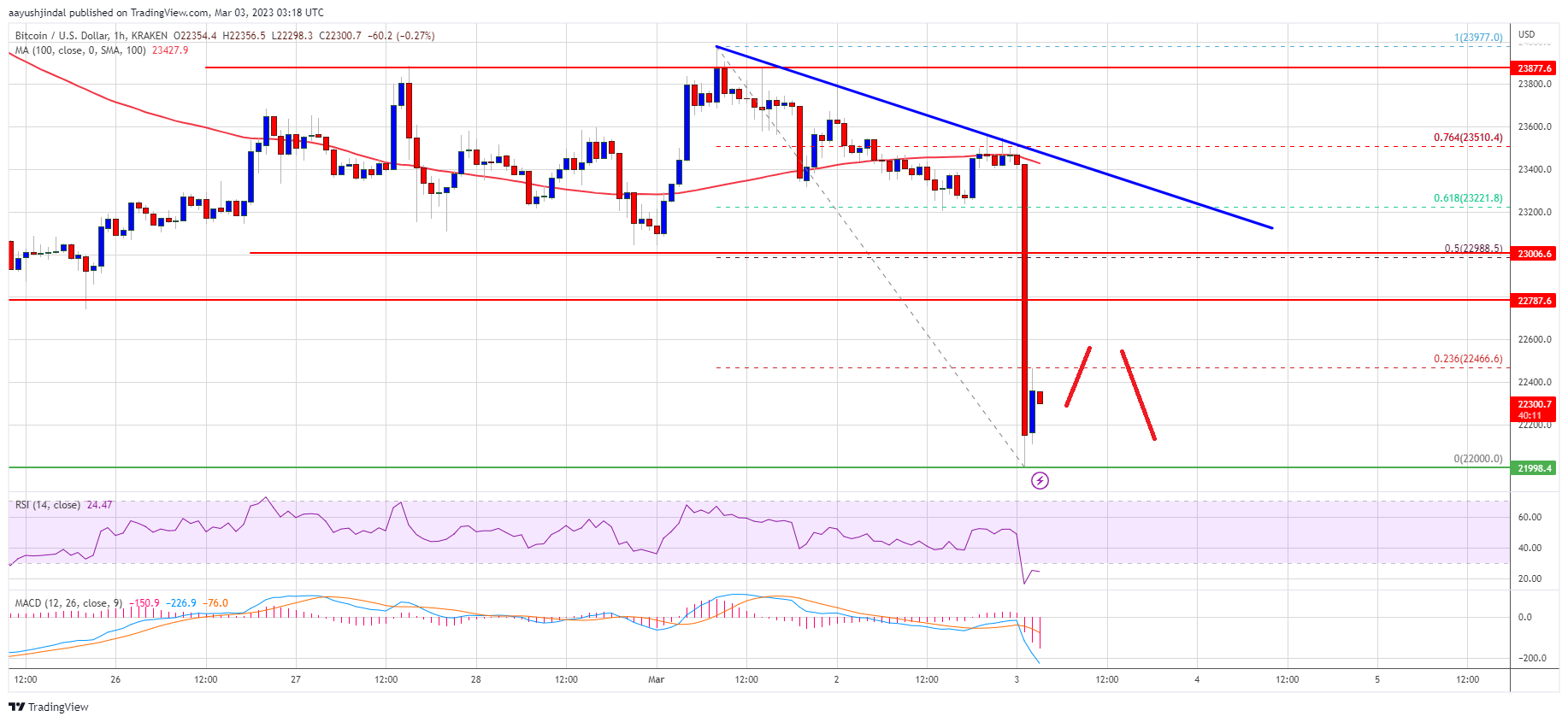 The bears pushed the price below the $22,500 support zone and the 100 hourly simple moving average. It even tested the $22,000 support zone. A low is formed near $22,000 and the price is now consolidating losses. It is trading well below $23,020 and the 100 hourly simple moving average.