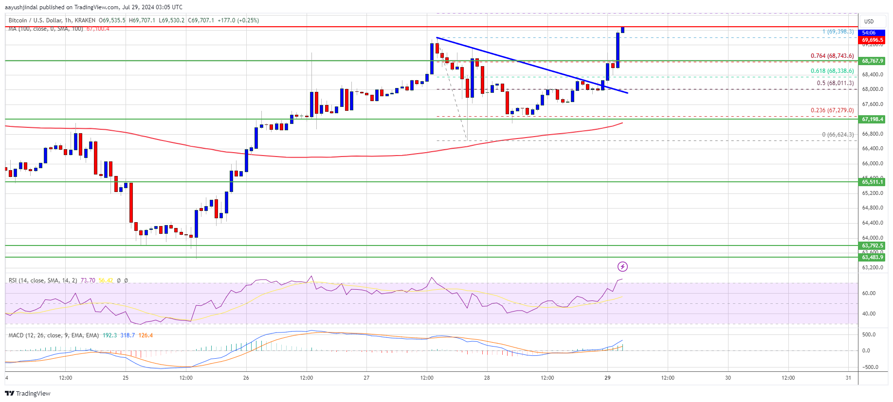 There was a break above a key bearish trend line with resistance at $68,200 on the hourly chart of the BTC/USD pair. The pair gathered pace for a move above the 76.4% Fib retracement level of the downward move from the $69,398 swing high to the $66,6274 low.