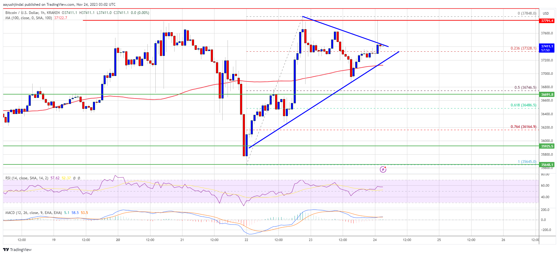 A high was formed near $37,848 and the price is now consolidating gains. There was a move below the 23.6% Fib retracement level of the upward move from the $35,645 swing low to the $37,848 high.