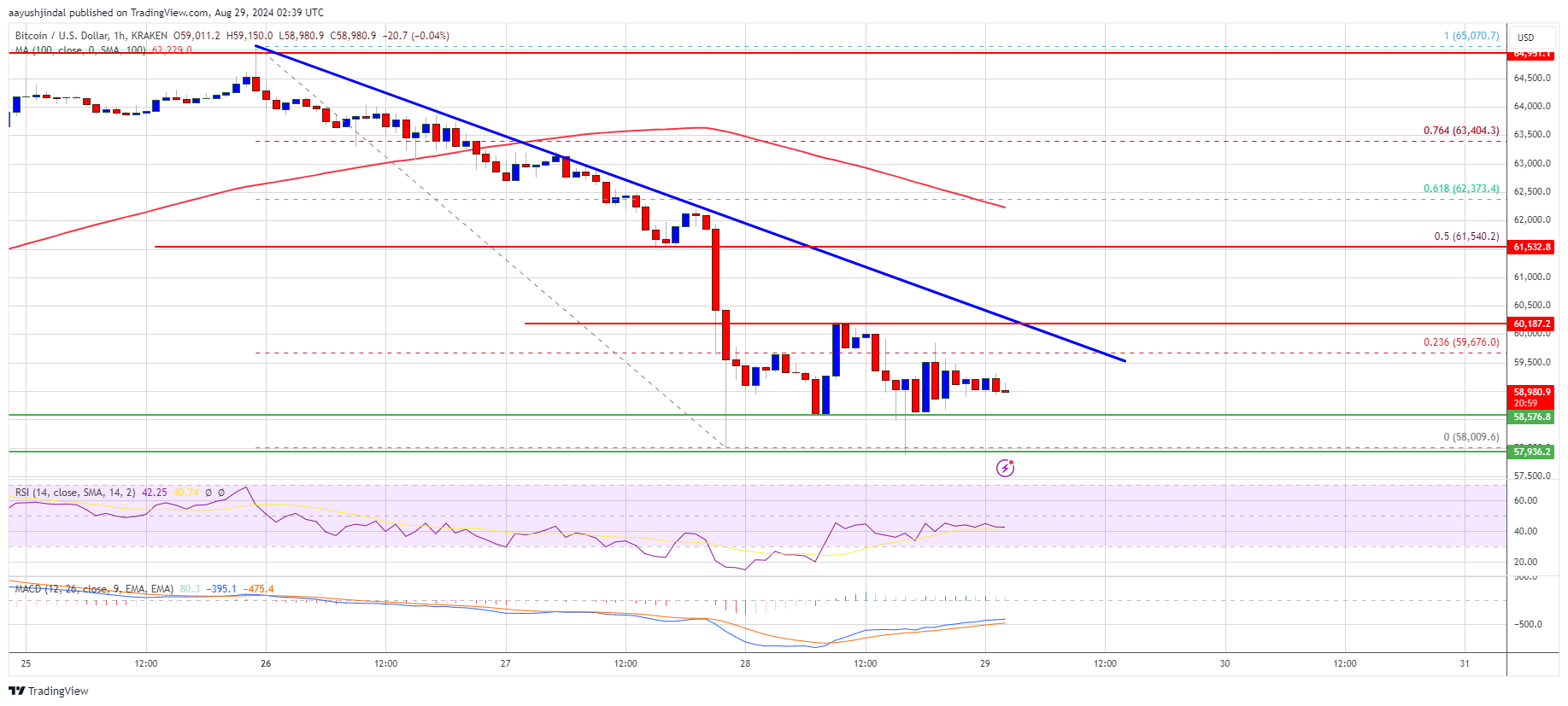 A low was formed at $58,009 and the price is now consolidating losses. There was a minor recovery wave above the $58,500 and $58,800 levels. The price tested the 23.6% Fib retracement level of the downward wave from the $65,070 swing high to the $58,009 low.