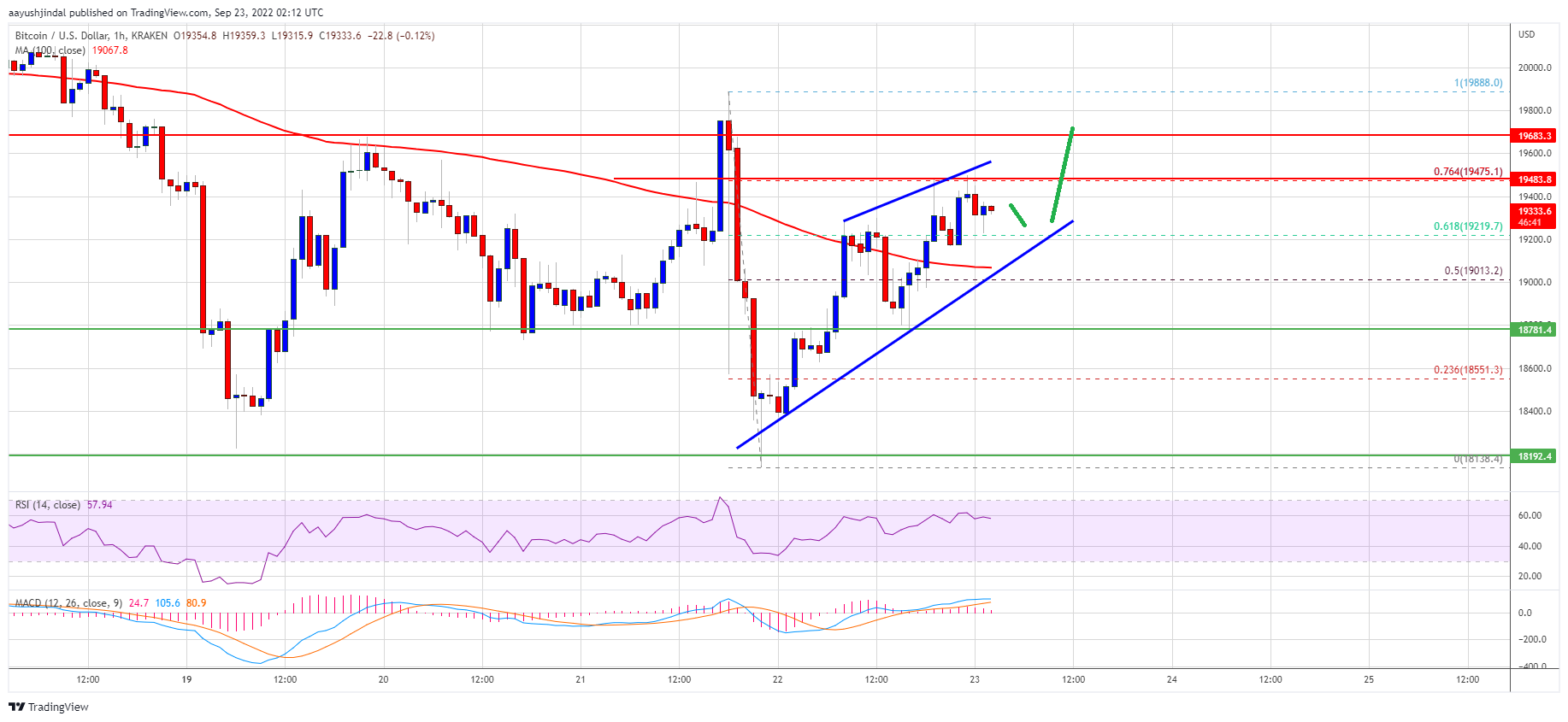 There is also a key contracting triangle forming with support near $19,200 on the hourly chart of the BTC/USD pair. Bitcoin price is showing a few positive signs above the $19,000 level.