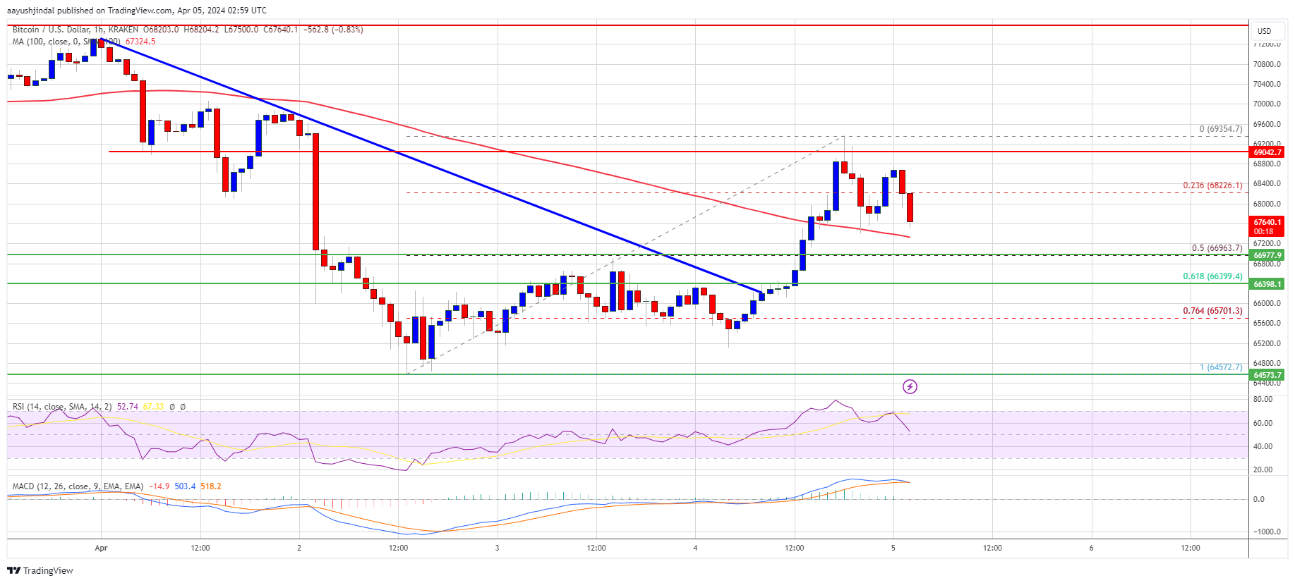 There was a break above a key bearish trend line with resistance at $66,350 on the hourly chart of the BTC/USD pair. The pair even spiked above the $69,000 zone. A high was formed at $69,354 and the price is now consolidating gains.