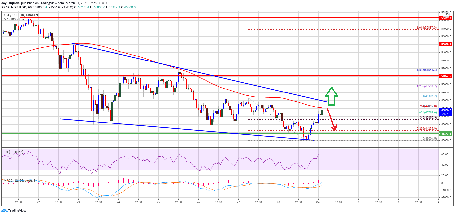 Bitcoin price traded to a new swing low at $43,000 before correcting higher against the US Dollar. BTC is now facing a strong resistance near $47,000 and the 100 hourly SMA.