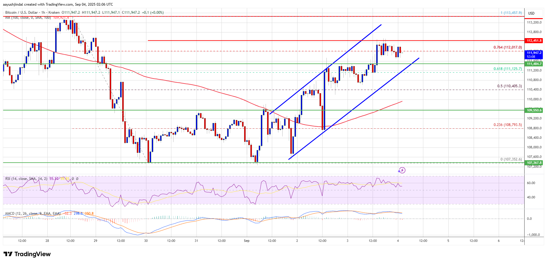 Bitcoin price is attempting a recovery wave above $111,000. BTC is now rising and might gain pace if it clears the $112,500 resistance level.