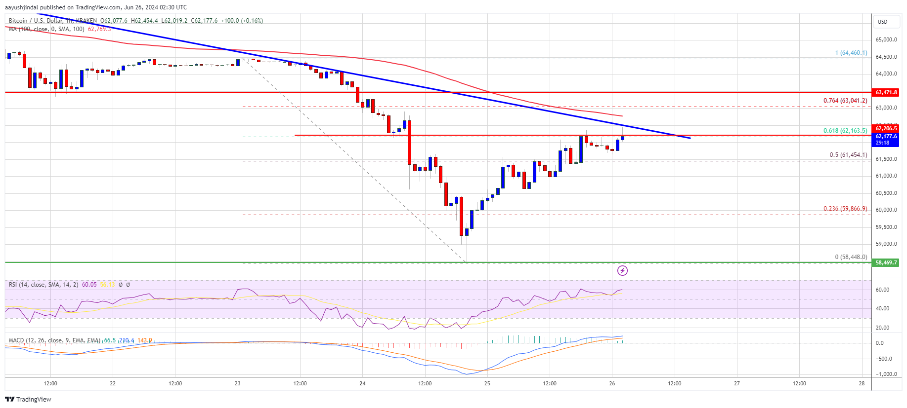 The price climbed above the 50% Fib retracement level of the downward wave from the $64,460 swing high to the $58,448 low. It even moved above the $62,000 pivot level. However, Bitcoin price is still trading below $63,000 and the 100 hourly Simple moving average.