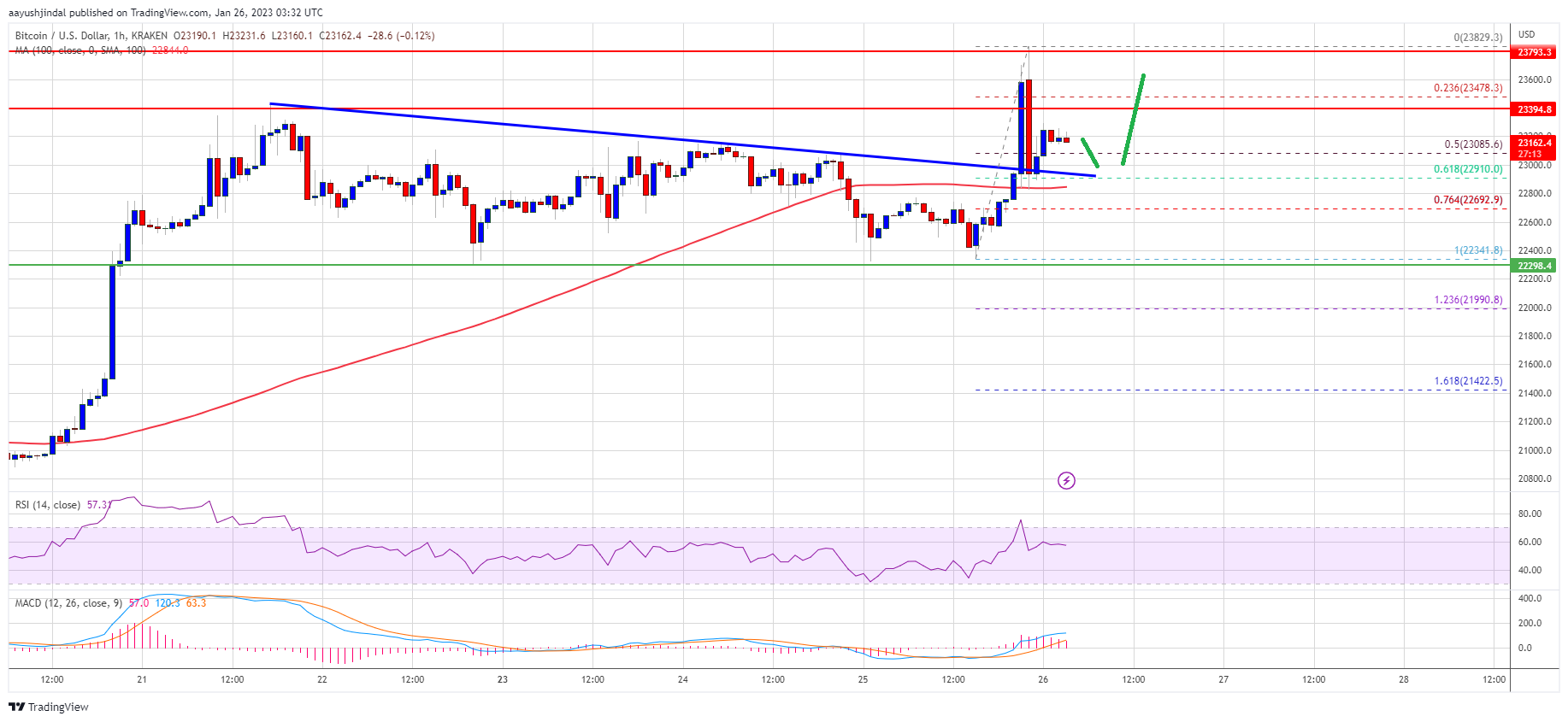 There was a clear move above the $23,000 resistance zone. Besides, there was a break above a major bearish trend line with resistance near $23,000 on the hourly chart of the BTC/USD pair. The pair surged to a new yearly high at $23,829 and is currently correcting gains.