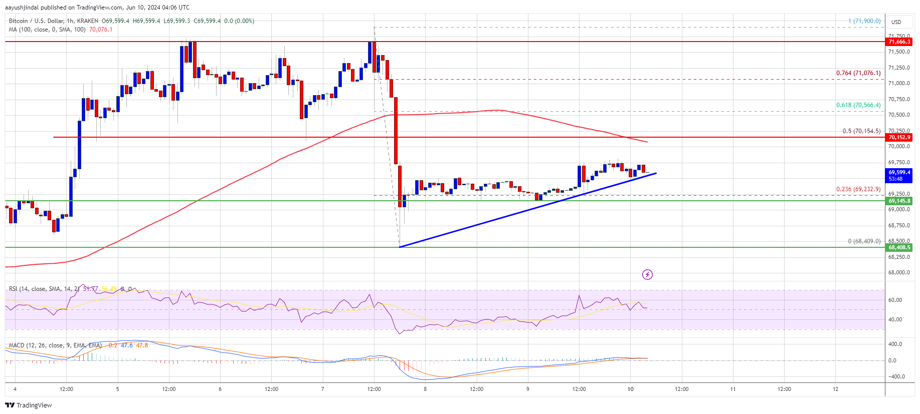 There was a move above the $69,250 resistance zone. The price climbed above the 23.6% Fib retracement level of the downward move from the $71,900 swing high to the $68,409 low.