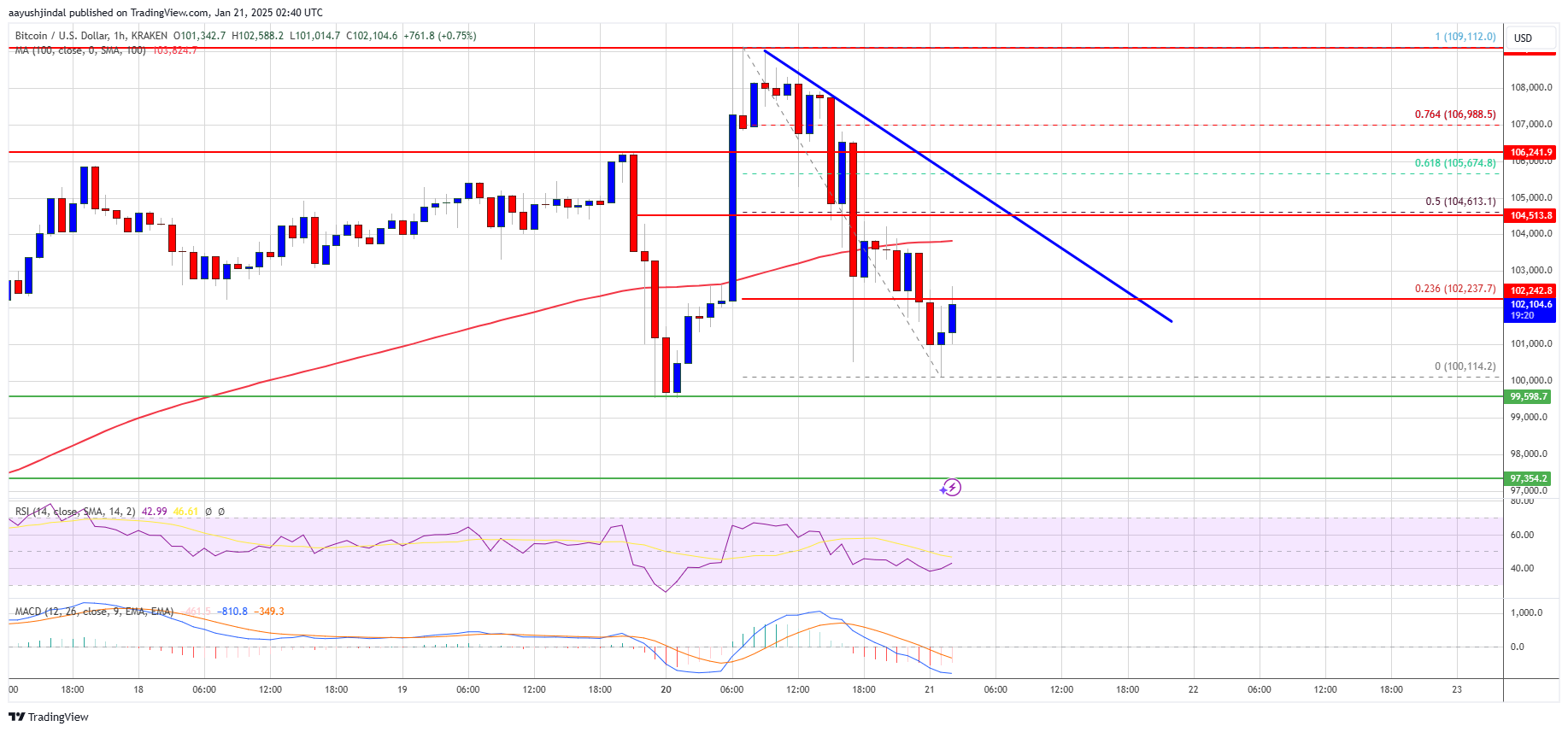 A low was formed at $100,114 and the price is now rising. There was a move toward the 23.6% Fib retracement level of the recent decline from the $109,112 swing high to the $100,114 low.