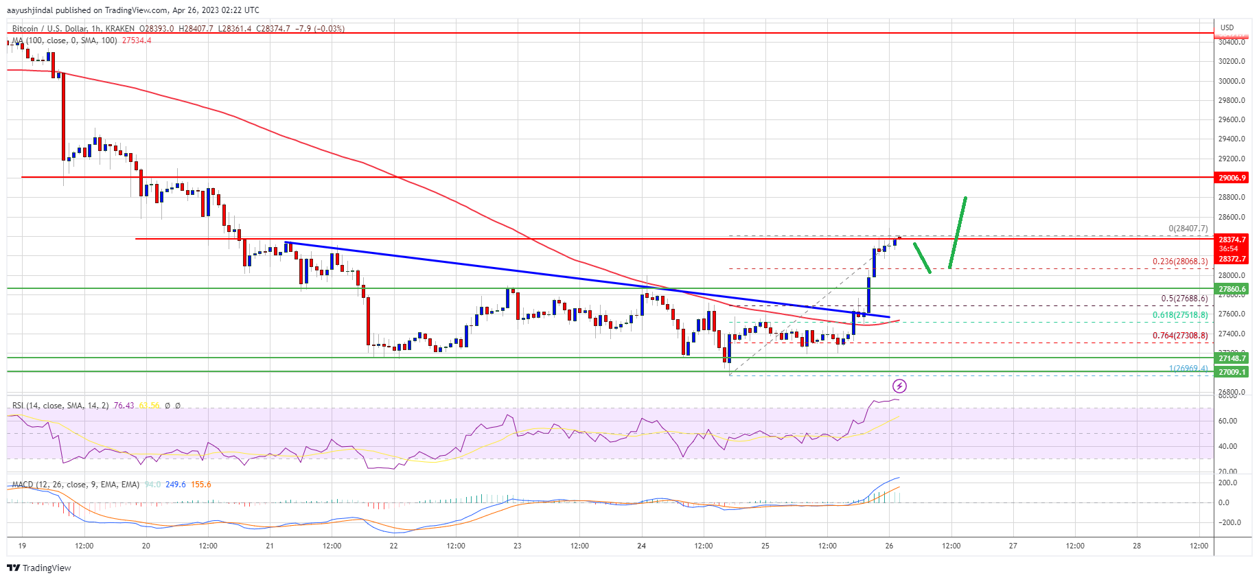 Bitcoin price is now facing resistance near the $28,400 level. A high is formed near $28,407 and the price is now consolidating gains. It is trading well above the 23.6% Fib retracement level of the recent increase from the $26,969 low to the $28,407 high.