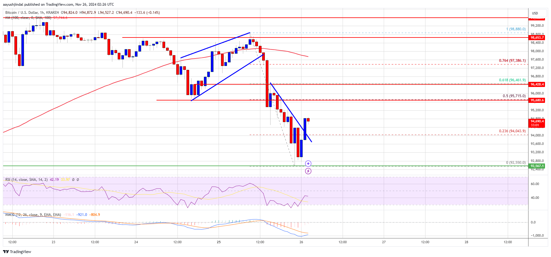 A low was formed at $92,550 and the price is now rising. There was a move above the $93,800 resistance level. The price cleared the 23.6% Fib retracement level of the downward move from the $98,880 swing high to the $92,550 low.