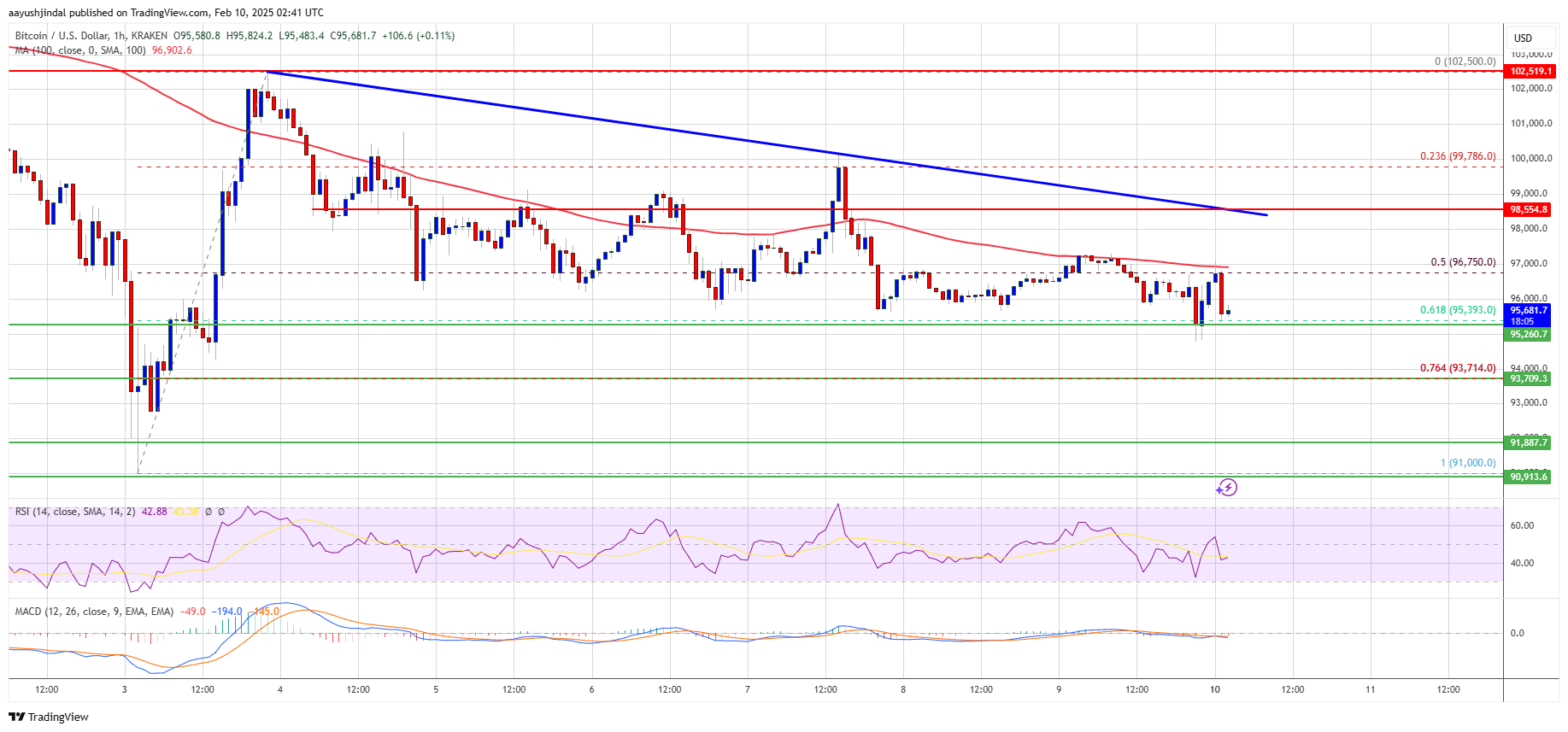 There was a move below the 50% Fib retracement level of the upward move from the $91,000 swing low to the $102,500 high. The price even spiked below the $95,500 support level and settled below the 100 hourly Simple moving average.