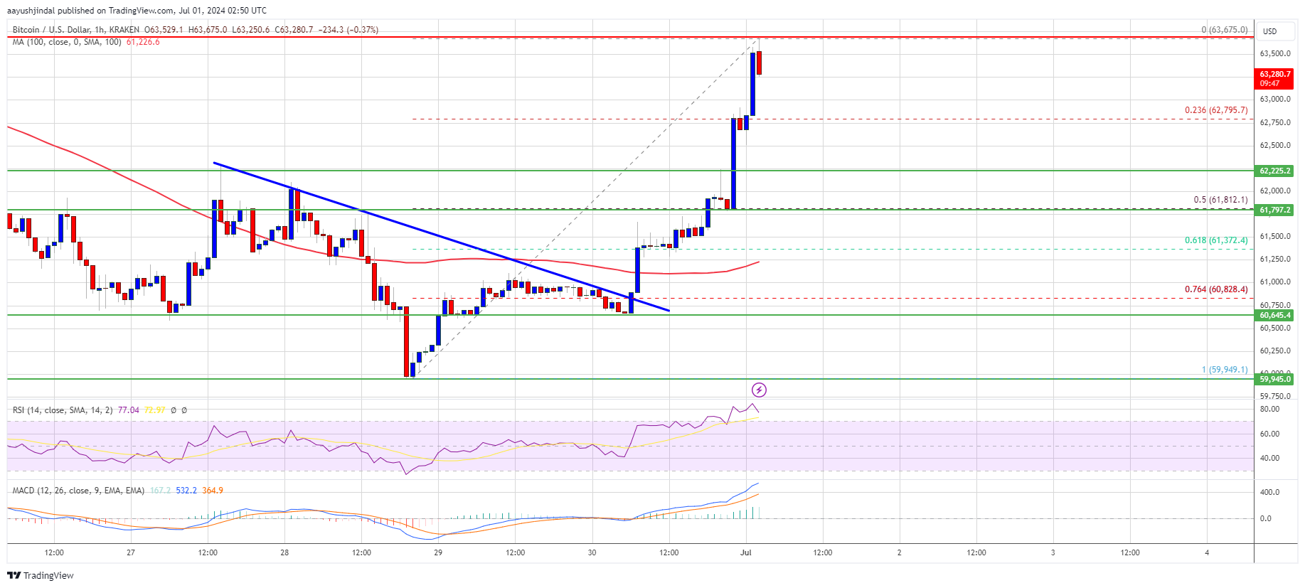 There was a break above a major bearish trend line with resistance at $61,000 on the hourly chart of the BTC/USD pair. The bulls were able to pump the price above the $62,500 resistance. It is up nearly 5% and trading near the $63,650 resistance zone.