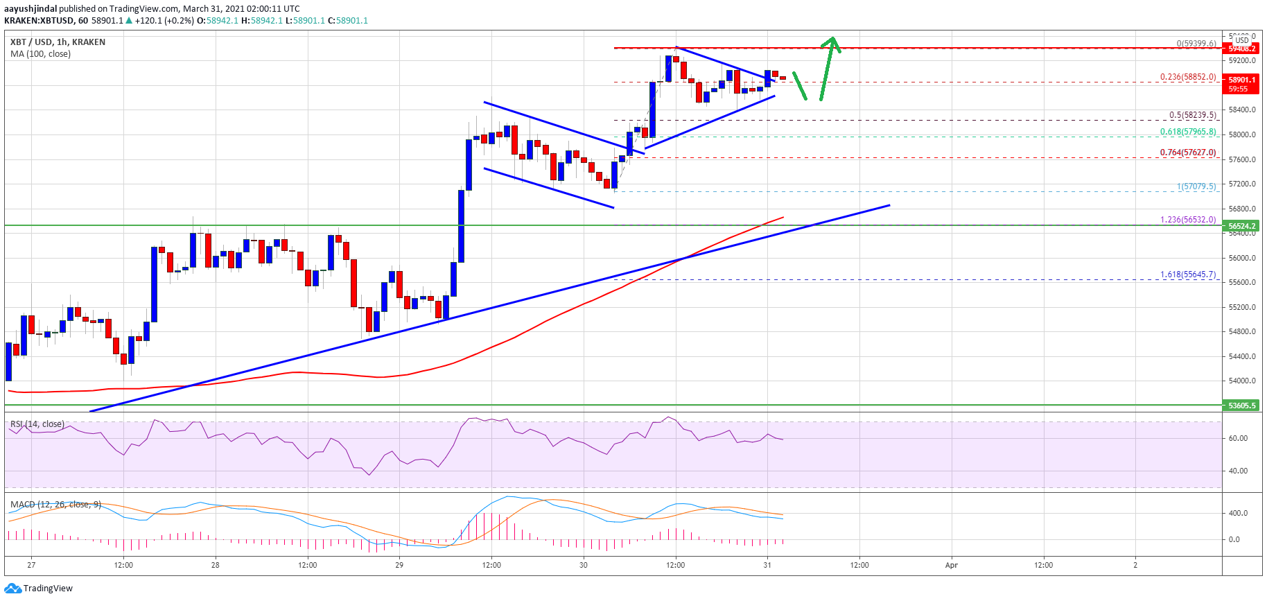During the increase, there was a break above a couple of bullish patterns near $57,600 and $58,600 on the hourly chart of the BTC/USD pair. The pair even broke the $59,000 resistance and it settled nicely above the 100 hourly simple moving average.