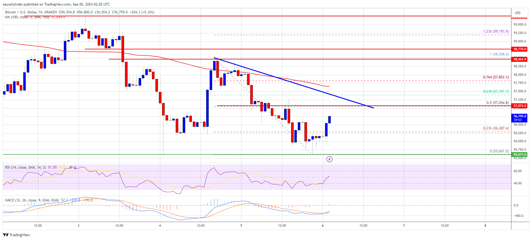 It retested the $55,600 support zone. A low was formed at $55,601 and the price recently started a recovery wave. There was a move above the $56,000 and $56,200 resistance levels. It cleared the 23.6% Fib retracement level of the downward move from the $58,508 swing high to the $55,601 low.