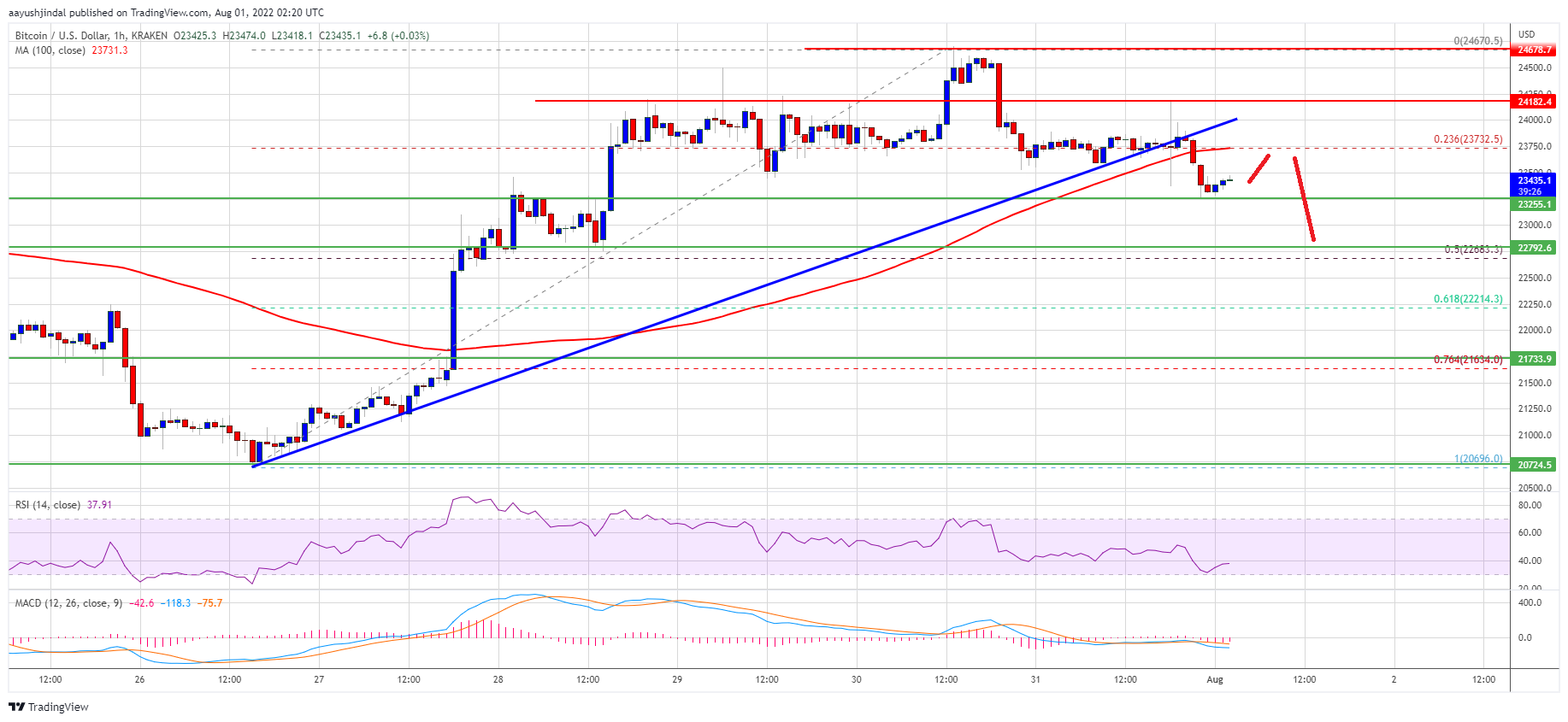 Bitcoin declined below the 23.6% Fib retracement level of the upward move from the $20,696 swing low to $24,670 high. Besides, there was a break below a key bullish trend line with support near $23,750 on the hourly chart of the BTC/USD pair.
