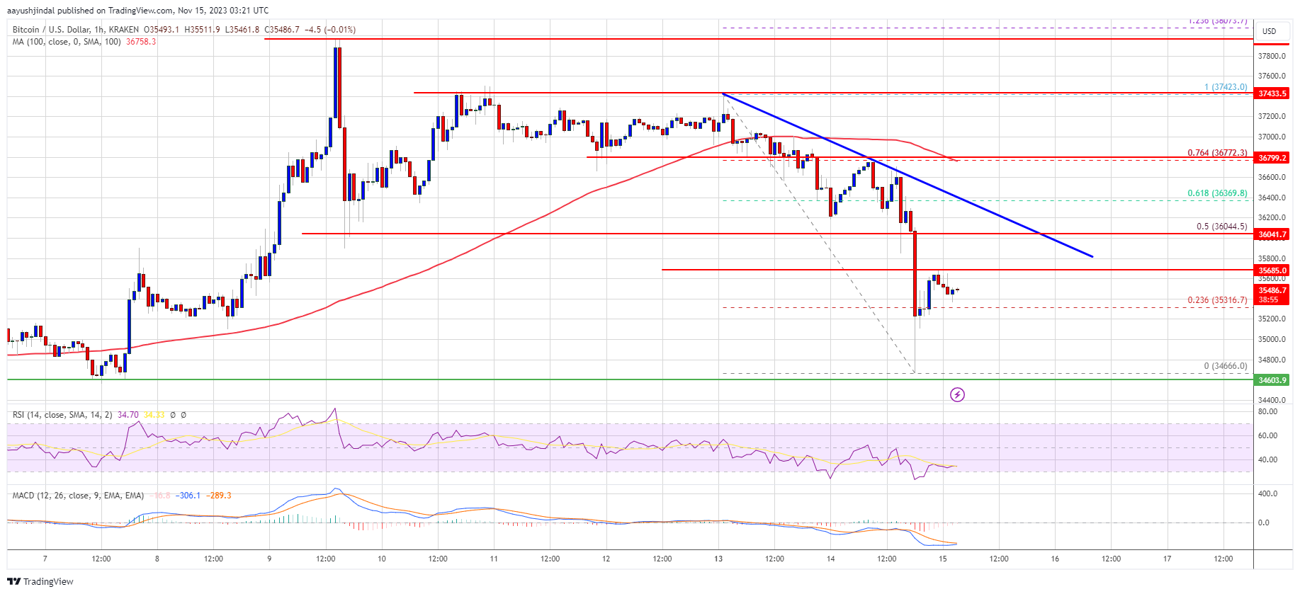 Bitcoin price failed to surpass the $37,500 resistance. BTC started a fresh decline from the $37,423 high and declined below many supports. There was a move below the $36,000 and $35,500 levels. The price even spiked below $35,000.