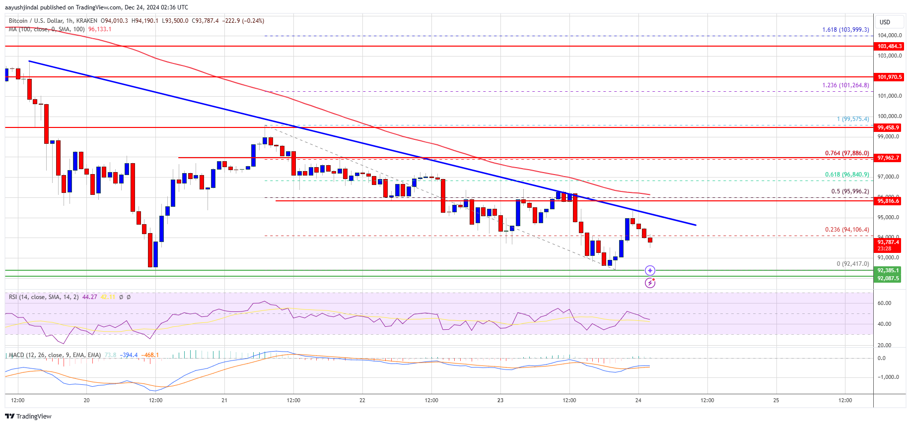 The price even spiked below $92,500. A low was formed at $92,417 and the price is now consolidating losses. There was a minor increase above the $94,000 level. The price climbed above the 23.6% Fib retracement level of the downward move from the $99,575 swing high to the $92,417 low.