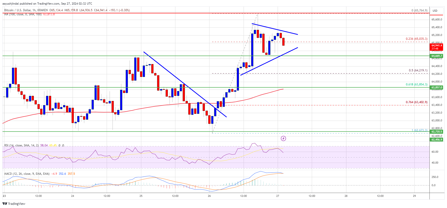 The bulls even pumped the price above $65,000. A high was formed at $65,764 and the price is now consolidating gains. There was a minor decline below the $65,200 level. The price dipped below the 23.6% Fib retracement level of the upward move from the $62,673 swing low to the $65,764 high.