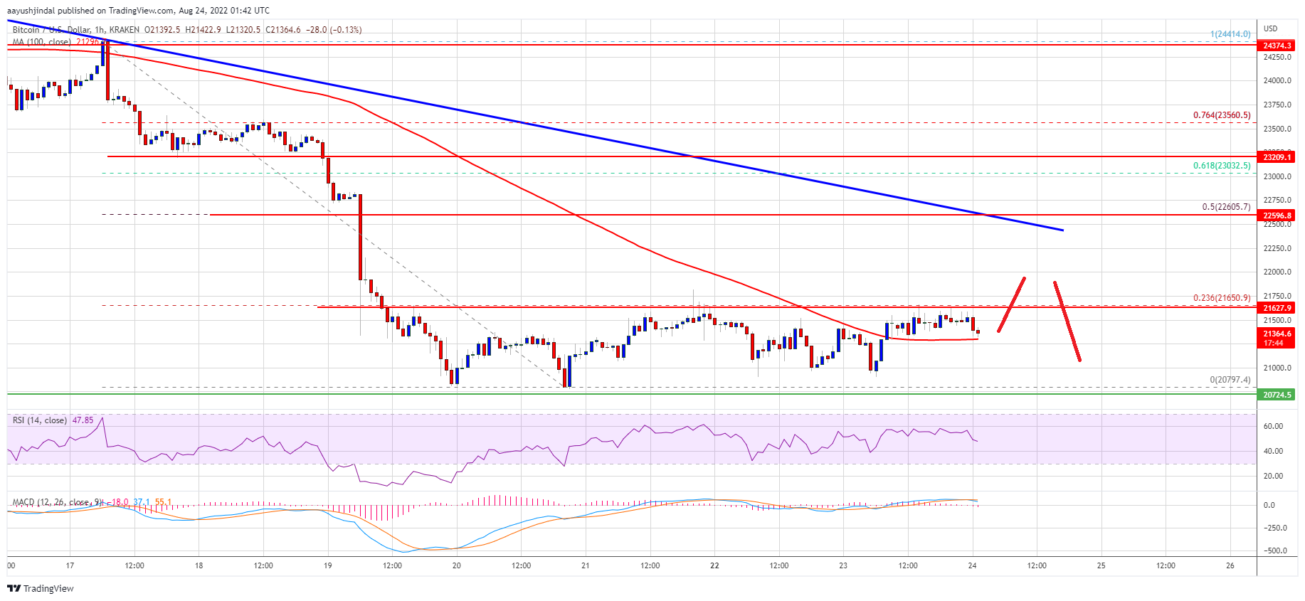 It seems like the 23.6% Fib retracement level of the main drop from the $24,415 swing high to $20,797 low is acting as a strong resistance. Bitcoin price is now trading above the $21,200 level and the 100 hourly simple moving average.