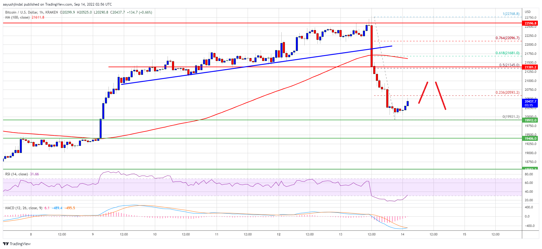 Besides, there was a break below a key bullish trend line with support near $21,810 on the hourly chart of the BTC/USD pair. Bitcoin price even tested the $20,000 zone. A low is formed near $19,921 and the price is now consolidating losses.