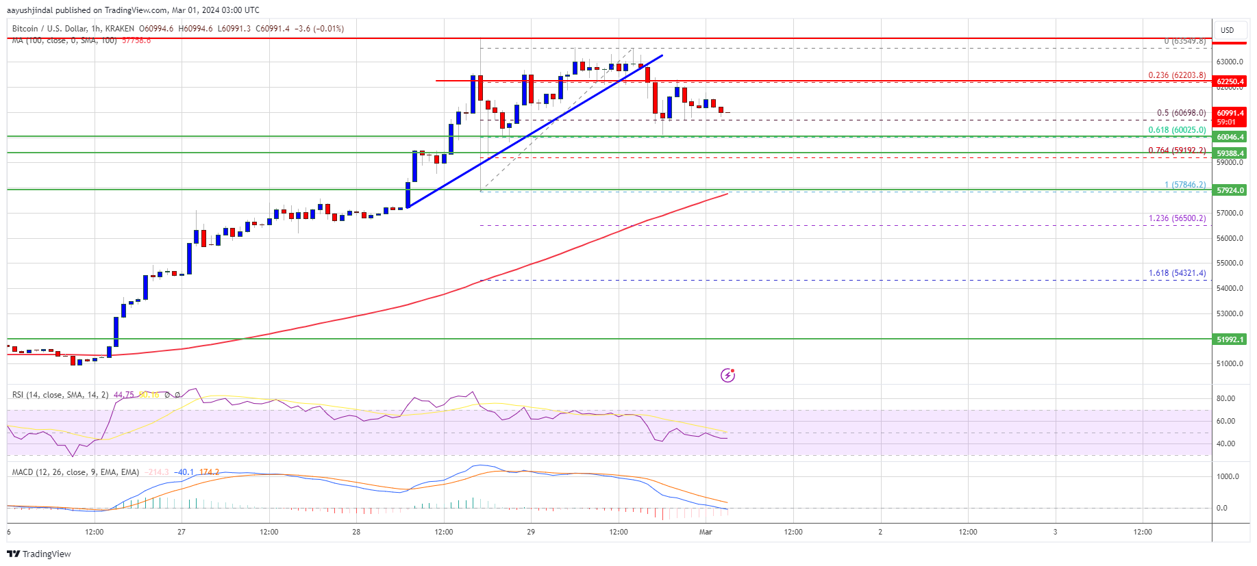 - The pair could correct lower toward $60,000 or even to the 100 hourly Simple moving average.