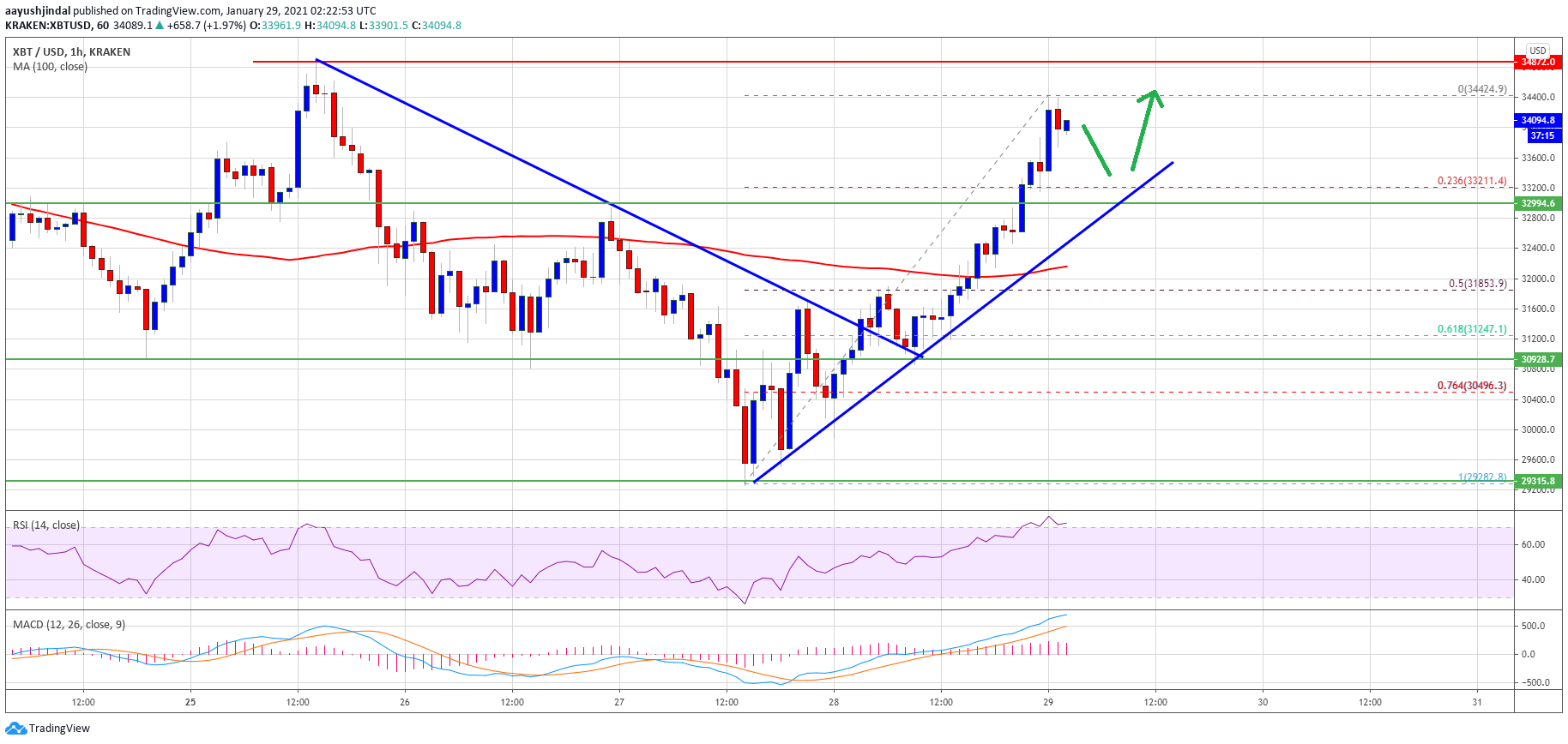 During the increase, there was break above a key bearish trend line with resistance near $31,550 on the hourly chart of the BTC/USD pair. The increase was such that the pair even cleared the $34,000 resistance and settled above the 100 hourly simple moving average.