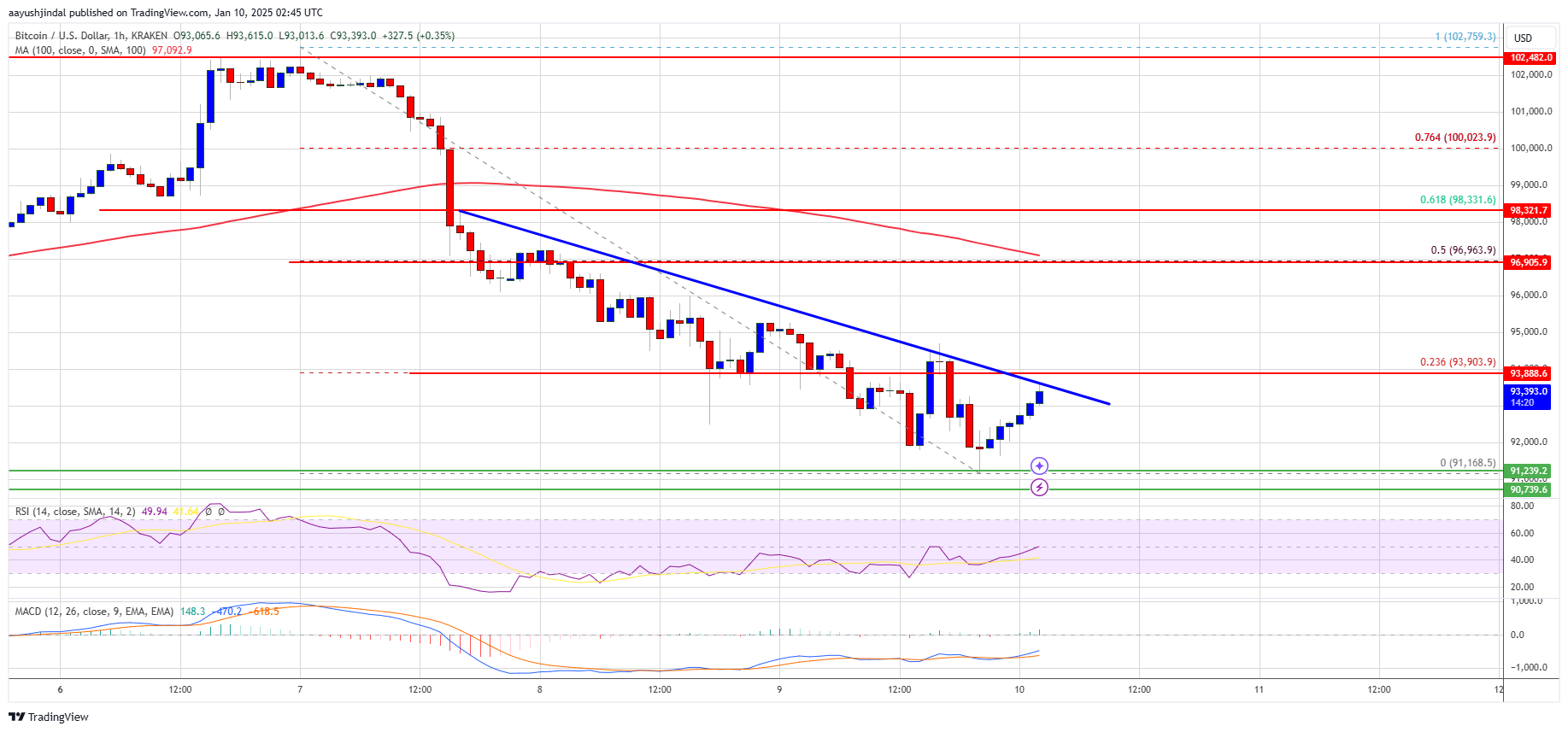 There was a clear move below the $92,000 support zone. The price even traded below $91,200. A low was formed at $91,168 and the price is now consolidating losses below the 23.6% Fib retracement level of the recent decline from the $102,761 swing high to the $91,168 low.