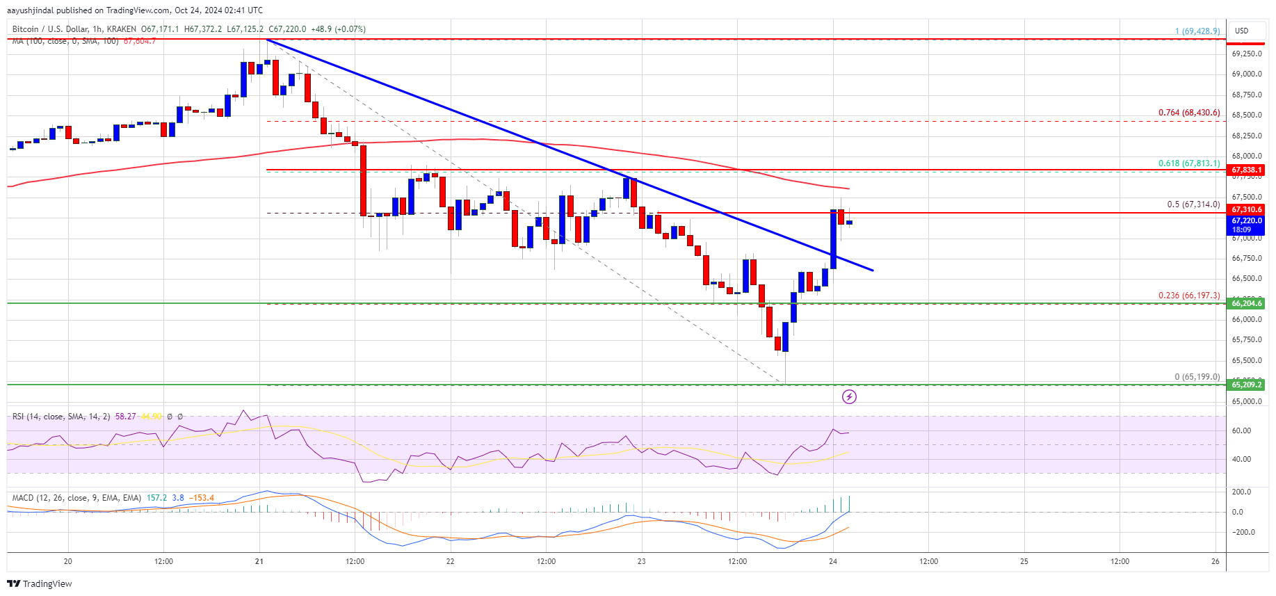 A low was formed at $65,199 and the price is again rising. There was a clear move above the $66,500 level. The price climbed above the 23.6% Fib retracement level of the downward move from the $69,425 swing high to the $65,199 low. Besides, there was a break above a key bearish trend line with resistance at $66,800 on the hourly chart of the BTC/USD pair.