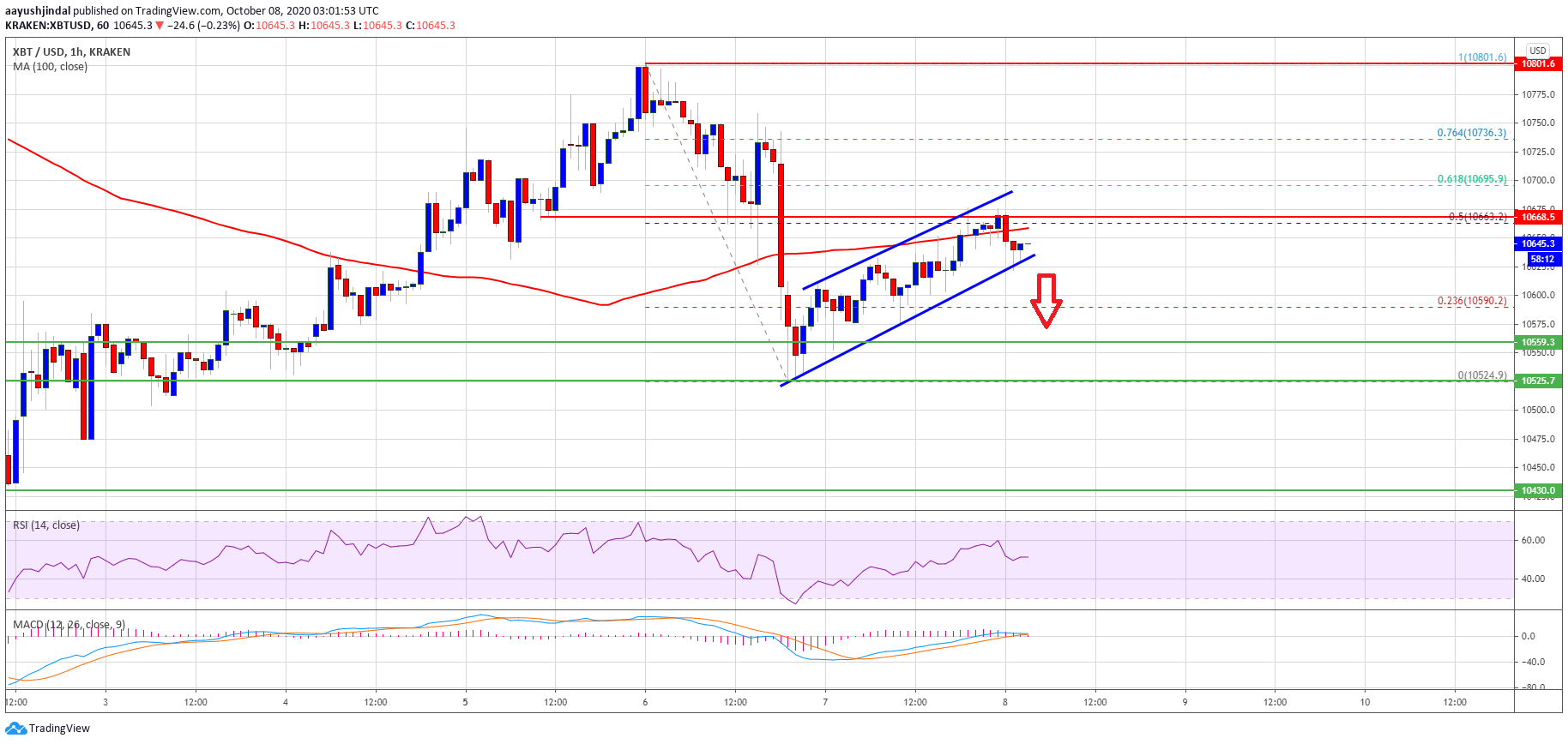 - There is a rising channel or a bearish flag pattern forming with support near $10,625 on the hourly chart of the BTC/USD pair (data feed from Kraken).