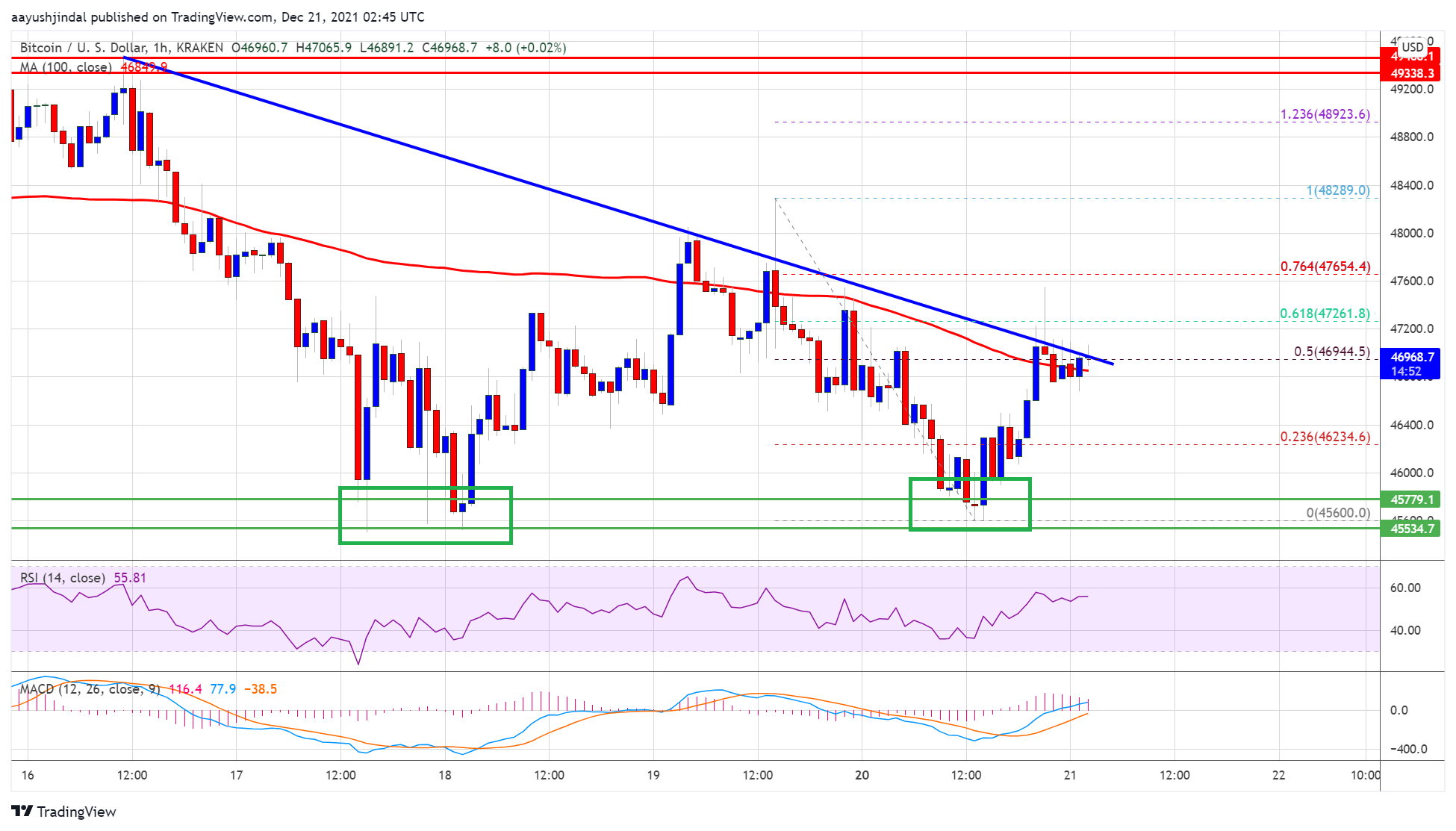A low was formed near $45,600 and the price is now recovering higher. It seems like the price is forming a double bottom pattern near the $45,500 zone. There was a move above the 23.6% Fib retracement level of the downward move from the $48,289 swing high to $45,600 low.