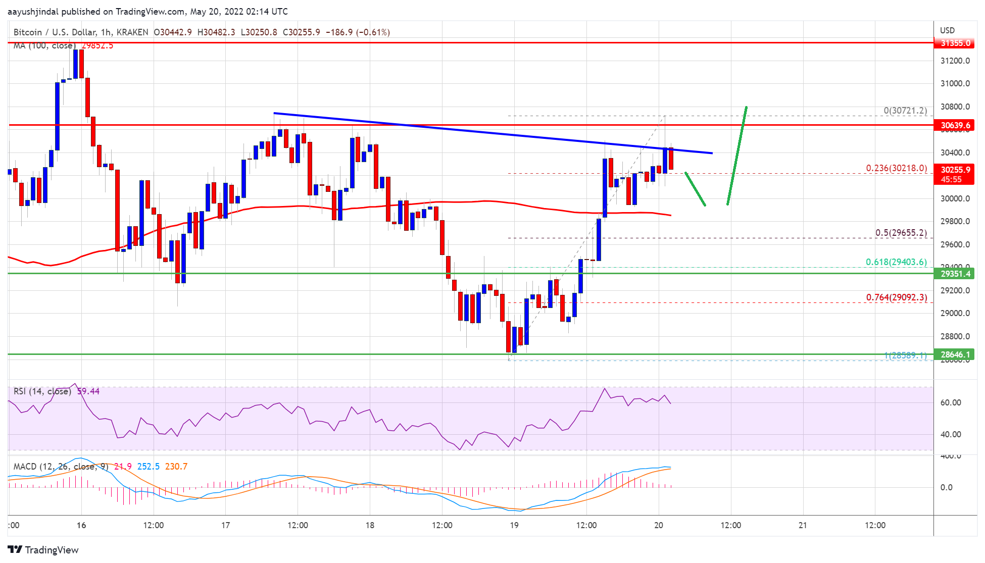 There is also a major bearish trend line forming with resistance near $30,400 on the hourly chart of the BTC/USD pair. A high is formed near $30,721 and the price is now consolidating gains.