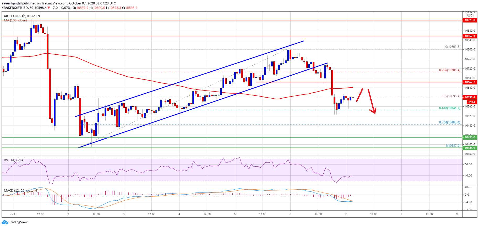 Bitcoin price failed to clear the $10,800 resistance and started a fresh decline against the US Dollar. BTC could continue to move down below $10,500 as long as it is below the 100 hourly SMA.