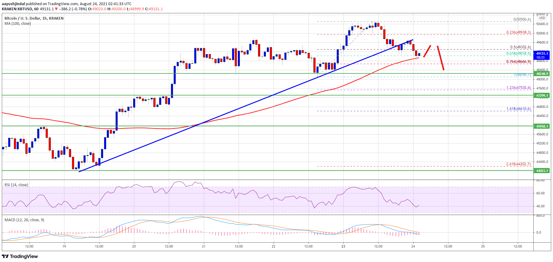 There was a break below the $50,000 and $49,800 levels. The bears pushed the price below the 50% Fib retracement level of the upward move from the $48,098 swing low to $50,506 high. There was also a break below a key bullish trend line with support near $49,500 on the hourly chart of the BTC/USD pair.