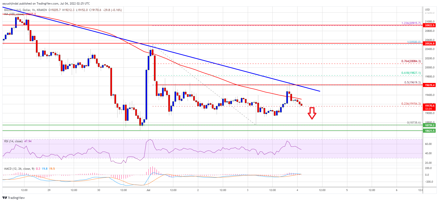 - The pair could start a fresh decline unless there is a move above the $19,500 resistance zone.