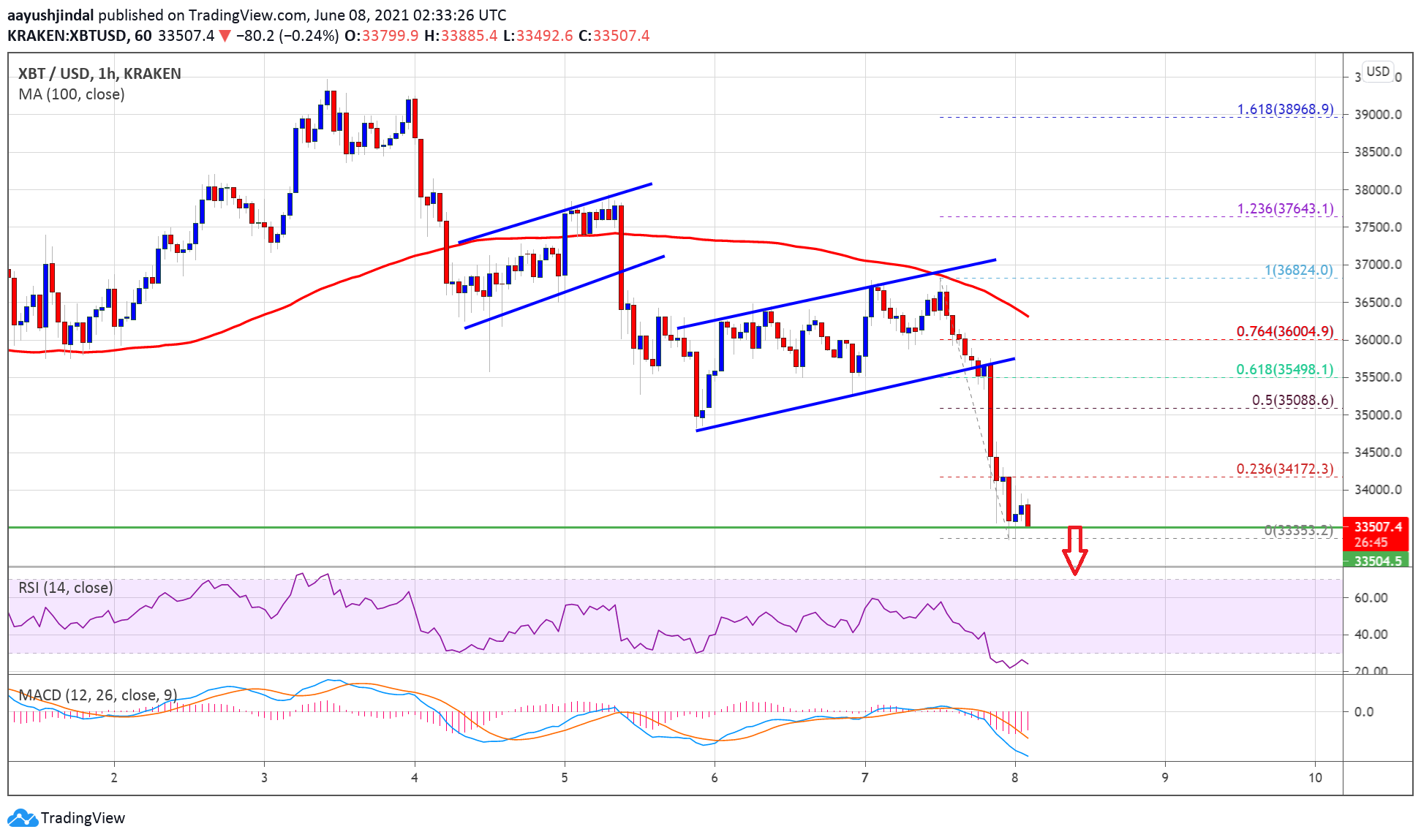 There was a clear break below a major ascending channel with support near $35,600 on the hourly chart of the BTC/USD pair. The pair gained pace below the $35,00 support level and it even broke $34,200. There was a spike below the $34,000 level and the price is currently struggling to recover.
